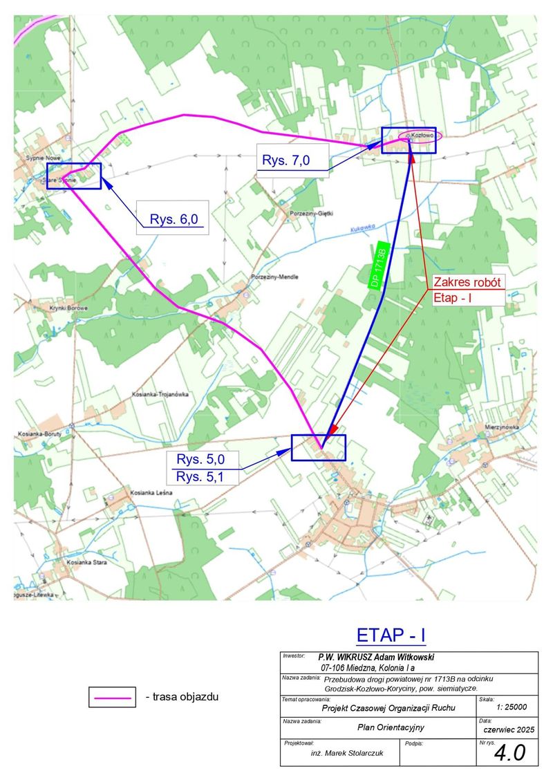 Jak informuje wykonawca robót firma Wikrusz, ze względu na planowane roboty drogowe t.j.: wykonywanie podbudowy stabilizowanej cementem w okresie od 11 lipca do dnia 31 lipca (br.) droga powiatowa 1713B na odcinku Grodzisk-Kozłowo będzie całkowicie zamknięta dla ruchu.Użytkownicy drogi proszeni są, by w tym czasie korzystać z objazdu do miejscowości Kozłowo i Koryciny przez miejscowość Stare Sypnie.