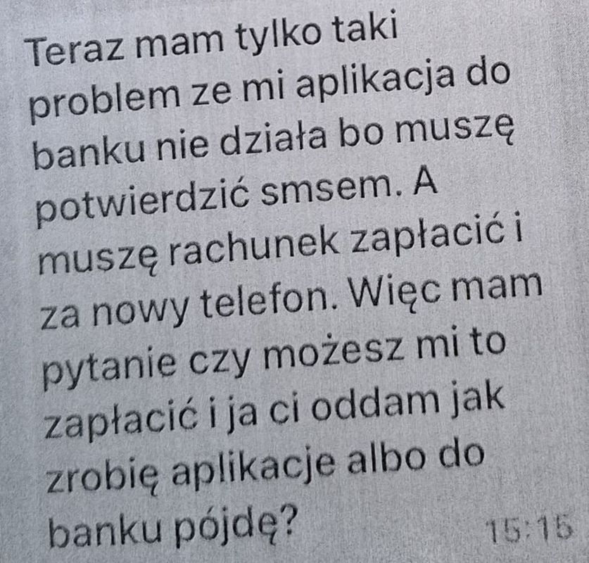 Do policjantów zgłosiła się 72-letnia mieszkanka powiatu bielskiego. Opowiedziała, że na jednym z portali społecznościowych otrzymała wiadomość z nieznanego numeru, podpisaną rzekomo imieniem jej córki. Z treści wynikało, że telefon córki wypadł z kieszeni spodni i wpadł do toalety, przez co jest nieaktywny. Nadawca wiadomości informował, że musi kupić nowy telefon, i poprosił o natychmiastowy przelew w wysokości 3995 złotych na konto znajomego.Wszystko wydawało się wiarygodne i kobieta uwierzyła, że prośba pochodzi od córki. Przelała wskazaną kwotę. Wkrótce potem otrzymała kolejną wiadomość z prośbą o następny przelew – tym razem w wysokości 4880 złotych. Seniorka próbowała zrealizować operację, ale system bankowy odrzucił ją z powodu przekroczenia limitu.