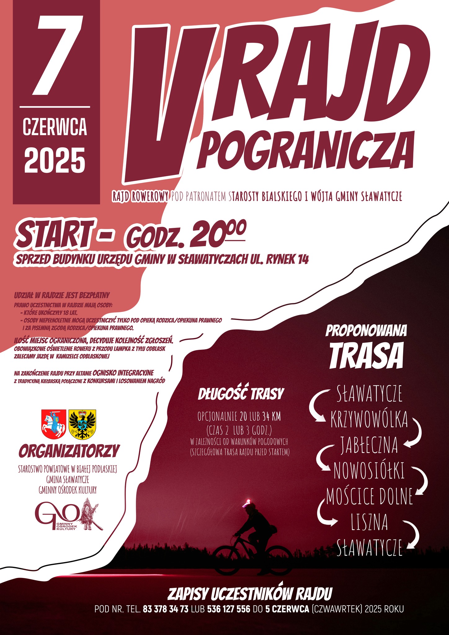 Piąta edycja nocnego rajdu rowerowego „Rajd Pogranicza” odbędzie się w Sławatyczach 7 czerwca. Start zaplanowano na godzinę 20:00, a miejsce zbiórki to plac przy budynku Urzędu Gminy Sławatycze.
