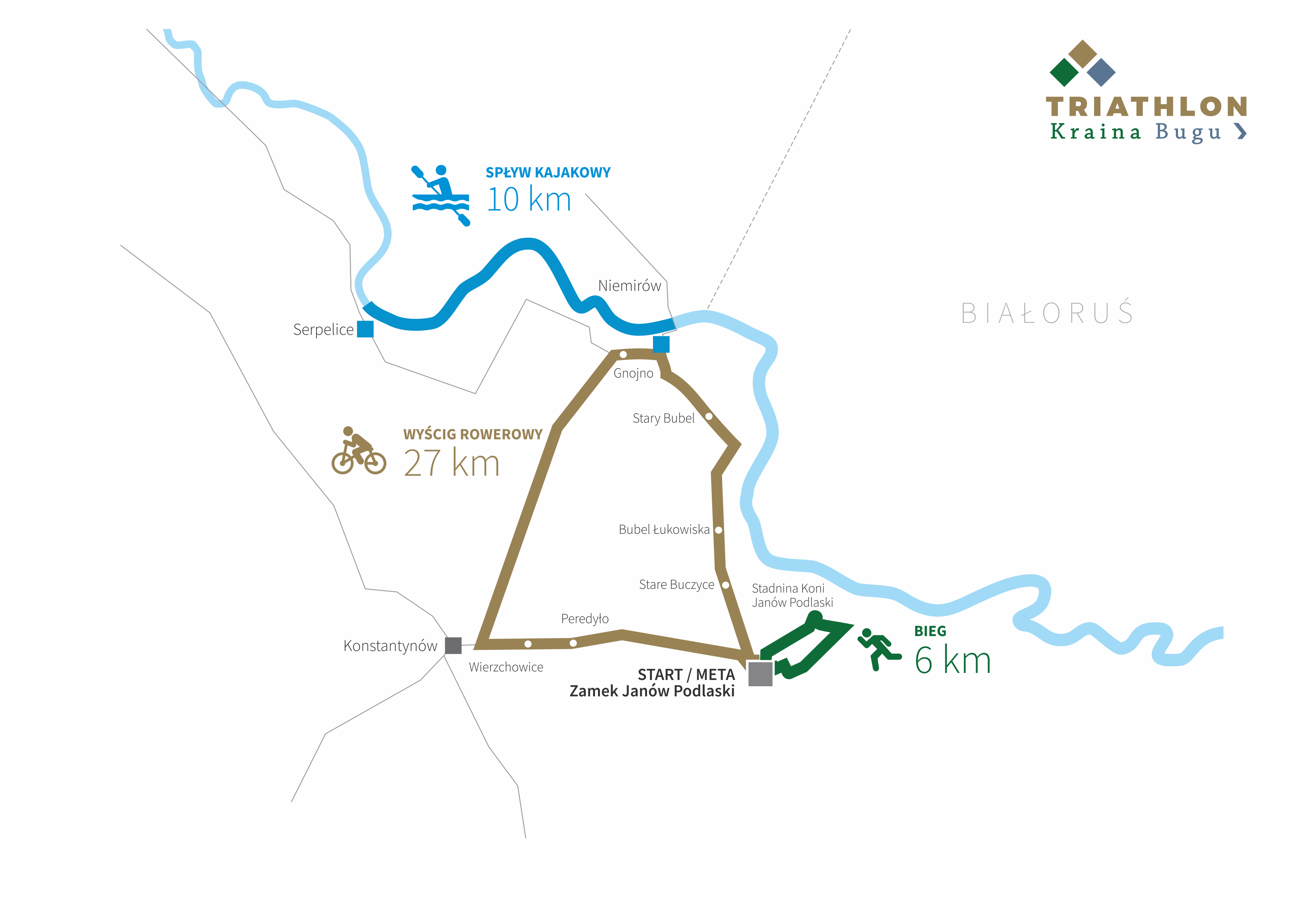 Triathlon i paratriathlon rozgrywane są w formule drużynowej. Zespoły składają się z 3–4 osób, w tym rowerzysty, biegacza oraz jednego lub dwóch kajakarzy. W drużynach paratriathlonowych przynajmniej dwie osoby muszą posiadać orzeczenie o niepełnosprawności. Trasy prowadzą przez malownicze tereny Lubelszczyzny i Podlasia – od rzeki Bug, przez Park Krajobrazowy Podlaski Przełom Bugu, po zabytkową Stadninę Koni w Janowie Podlaskim.Dystanse triathlonowe obejmują bieg na 5,8 km, 10-kilometrowy spływ kajakowy Bugiem oraz 27-kilometrowy wyścig rowerowy. W paratriathlonie trasa biegowa i rowerowa pozostają bez zmian, natomiast etap kajakowy odbywa się na stawie przy zamku i liczy 1,4 km.