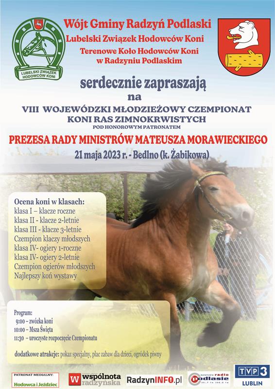 W niedzielę, 21 maja w Bedlnie koło Żabikowa odbędzie się VIII Wojewódzki Młodzieżowy Czempionat Koni Ras Zimnokrwistych. Patronat honorowy nad tym wydarzeniem objął Prezes Rady Ministrów Mateusz Morawiecki.