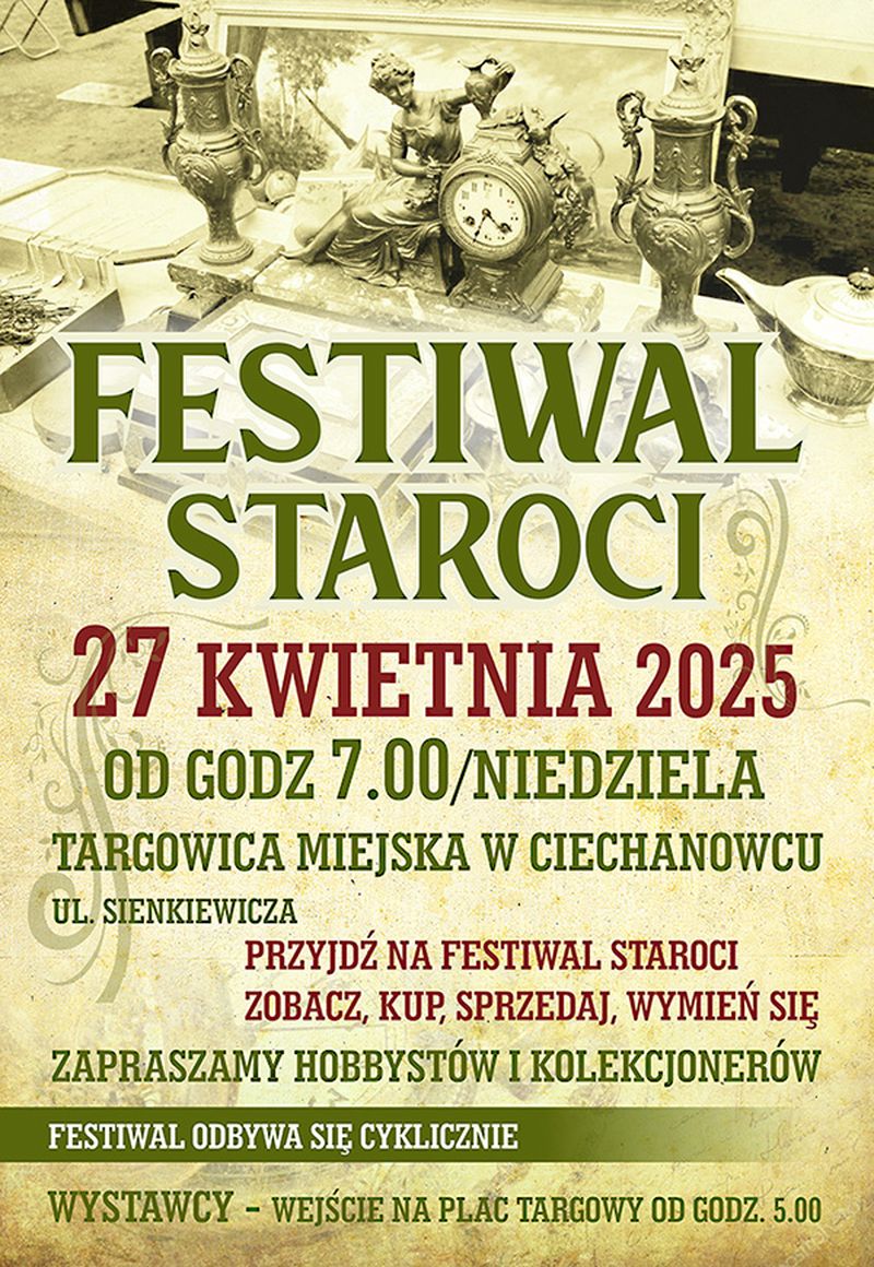 Festiwal Staroci na Targowisku Miejskim w Ciechanowcu odbywa się raz w miesiącu. Najbliższy zaplanowano w niedzielę 27 kwietnia, kolejny 18 maja. Teren targowiska dla wystawców otwarty będzie od godziny 5.00. Wstęp zarówno dla wystawców jak i kupujących jest wolny. Na festiwalu nie można sprzedawać przedmiotów, które są objęte dodatkowymi zezwoleniami lub akcyzą.