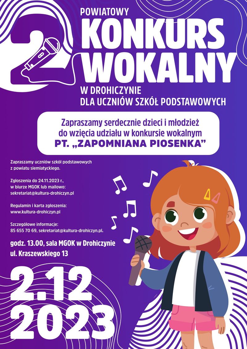 2 grudnia w Drohiczynie odbędzie się 2. Powiatowy Konkurs Wokalny dla uczniów szkół podstawowych ,,Zapomniana piosenka”. Jego celem jest promowanie młodych talentów dziecięcych i młodzieżowych, a także kultury i twórczości artystycznej w zakresie sztuki muzycznej.