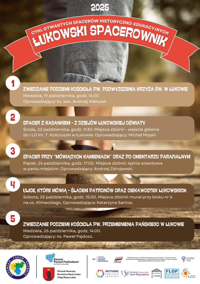 W ramach akcji zaplanowano pięć tematycznych spacerów, które poprowadzą lokalni przewodnicy i pasjonaci historii. W programie m.in. zwiedzanie podziemi łukowskich kościołów, odkrywanie tajemnic miejskiego cmentarza, historia oświaty oraz opowieści o ulicach i ich patronach.Harmonogram spacerów: