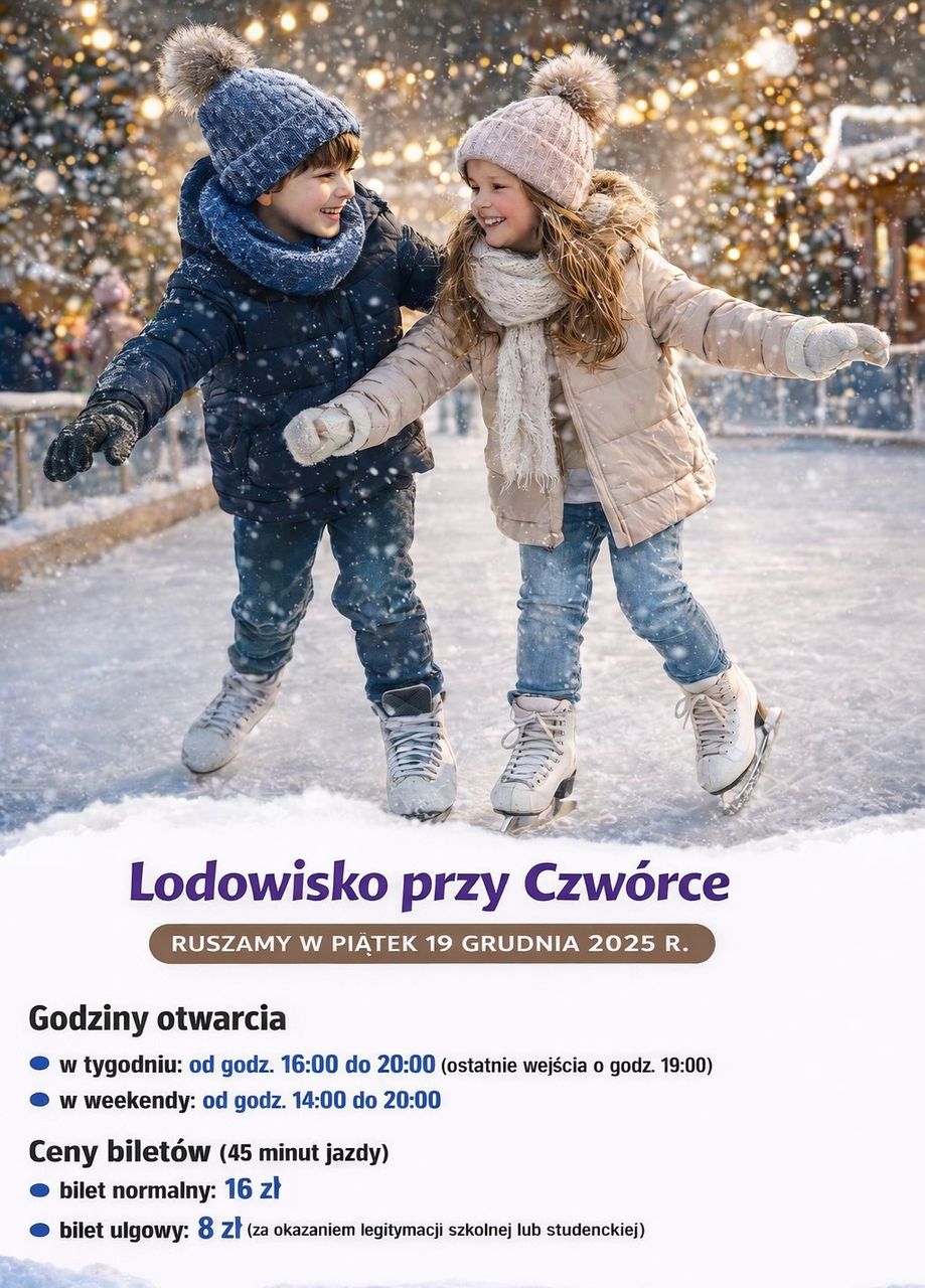 Lodowisko działa przy Szkole Podstawowej nr 4. Jest zadaszone. Będzie czynne od piątku, 19 grudnia. W tygodniu będzie można jeździć na łyżwach w godzinach od 16:00 do 20:00, a w weekendy – od 14:00 do 20:00. Bilet normalny na lodowisko będzie kosztował 16 zł, a ulgowy – 8 zł.