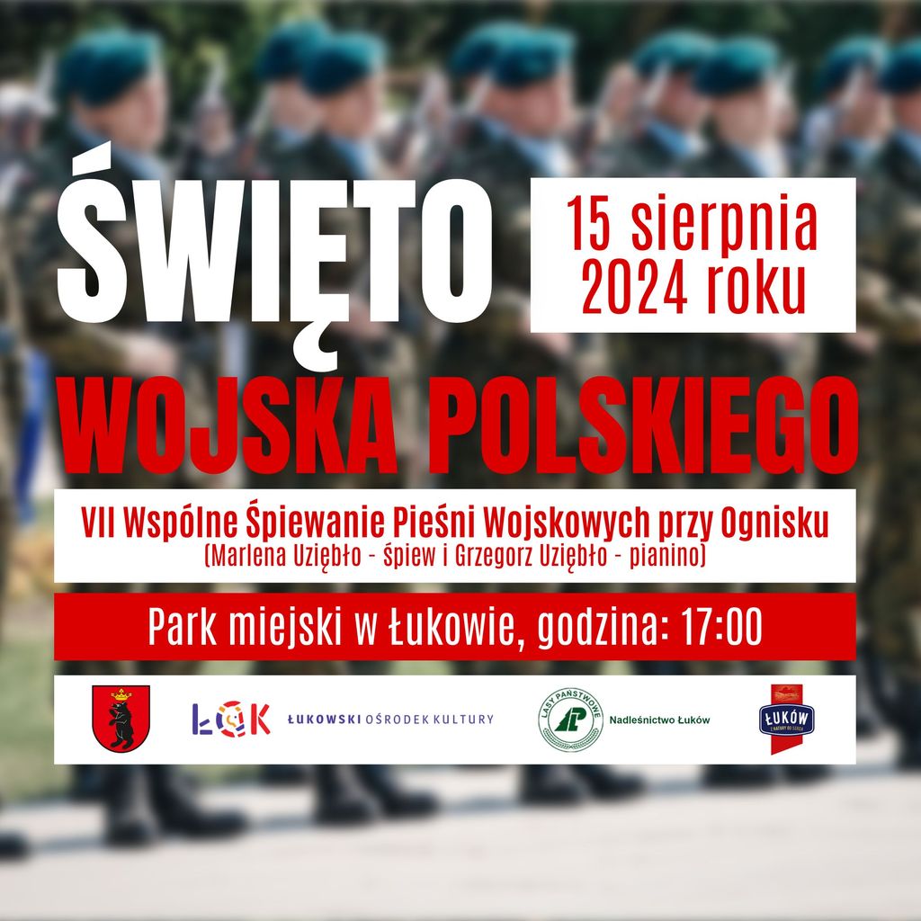 Przed nami obchody Święta Wojska Polskiego. Z tej okazji już po raz siódmy w parku miejskim w Łukowie odbędzie się wspólne śpiewanie pieśni wojskowych. Wydarzenie to organizuje Łukowski Ośrodek Kultury.