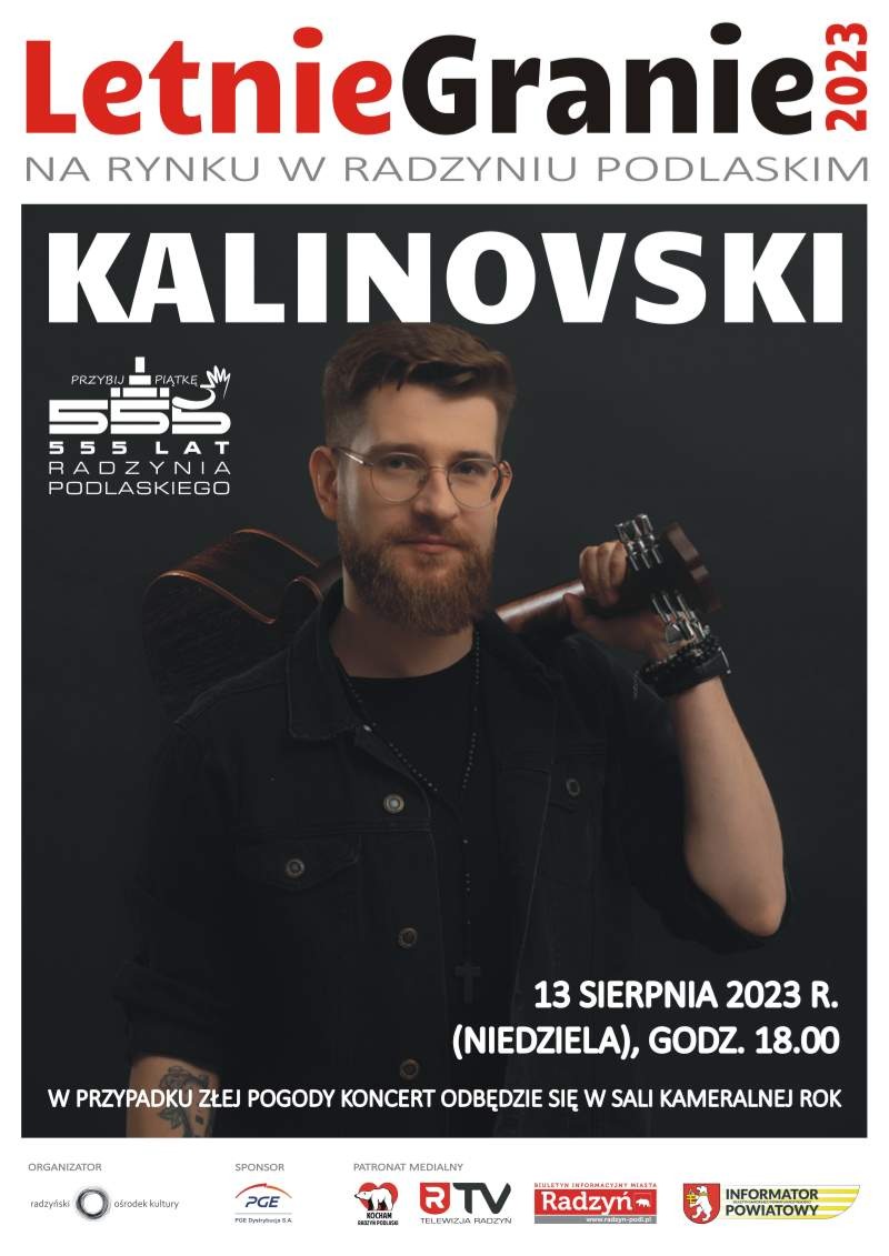 Kalinowski, a właściwie Adam Kalinowski dał się poznać szerszej publiczności dzięki XI edycji programu The Voice of Poland, gdzie doszedł do finału i zajął drugie miejsce. Artysta wydał niedawno swoją debiutancką płytę zatytułowaną „Być Może Ostatnia Płyta”. 13 sierpnia wokalista zagości na radzyńskim rynku podczas Letniego Grania 2023 o godzinie 18:00.