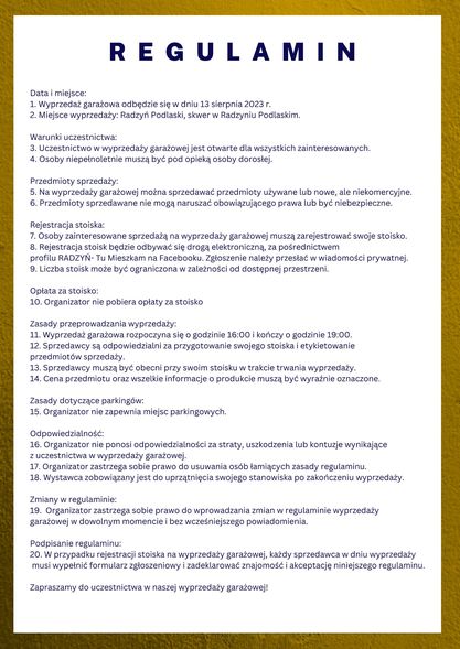 Ubierzcie się ładnie, nastrójcie na dobrą zabawę i ruszajcie na potańcówkę . Na miejscu czeka na was muzyka na żywo, którą zapewni Michał Nowacki z zespołem. Początek o godzinie 18:00. Wydarzenie wpisuje się w tegoroczne Dni Radzynia. Patronat medialny sprawują nad nim portal Podlasie24.pl oraz Katolickie Radio Podlasie.
