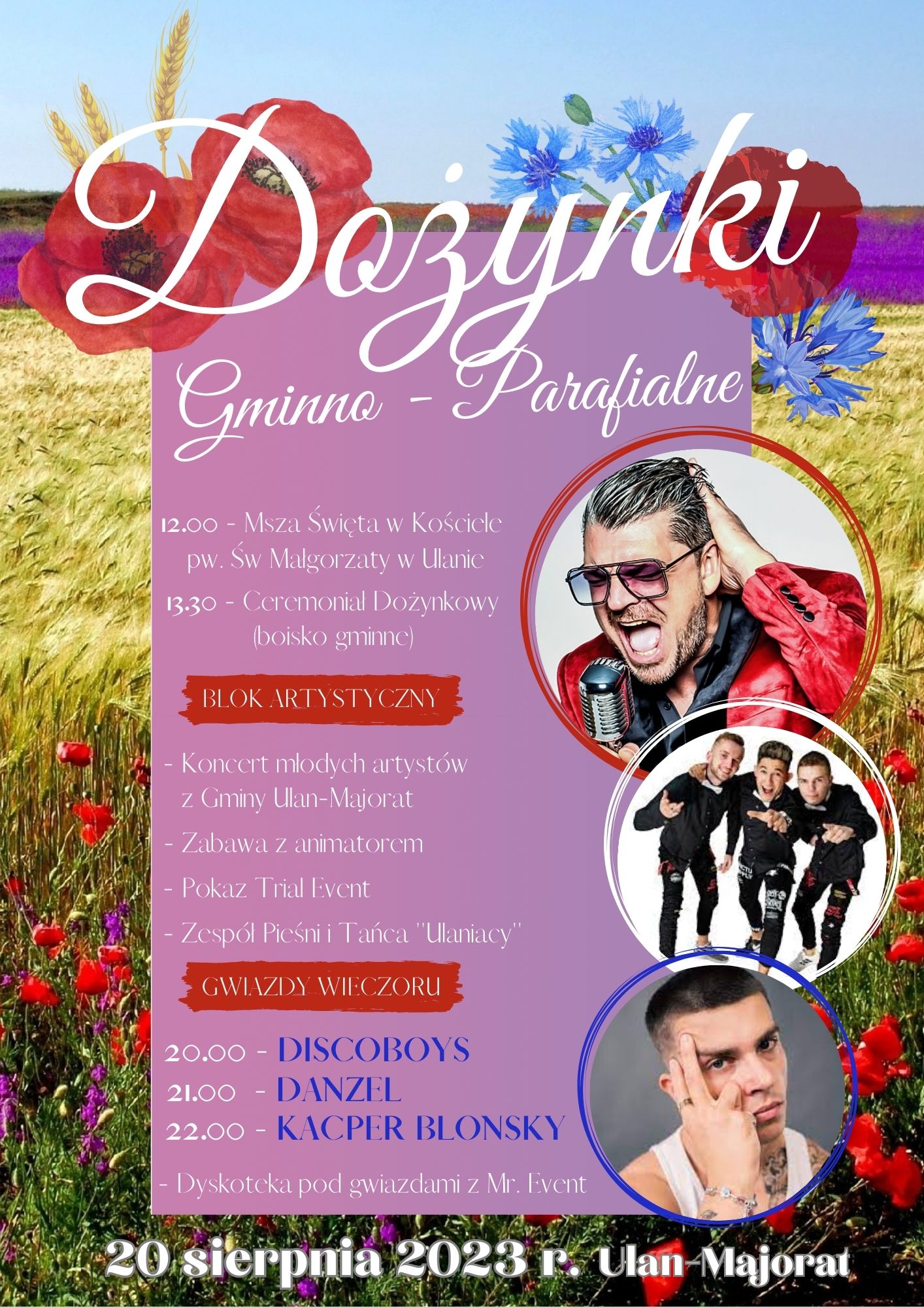 Kacper Blonsky, Discoboys oraz Danzel gwiazdami dożynek gminno-parafialnych w gminie Ulan-Majorat. Wydarzenie rozpocznie się Mszą świętą w kościele pw. Św. Małgorzaty w Ulanie o godzinie 12:00. Na zakończenie dyskoteka pod gwiazdami z Mr.Event.