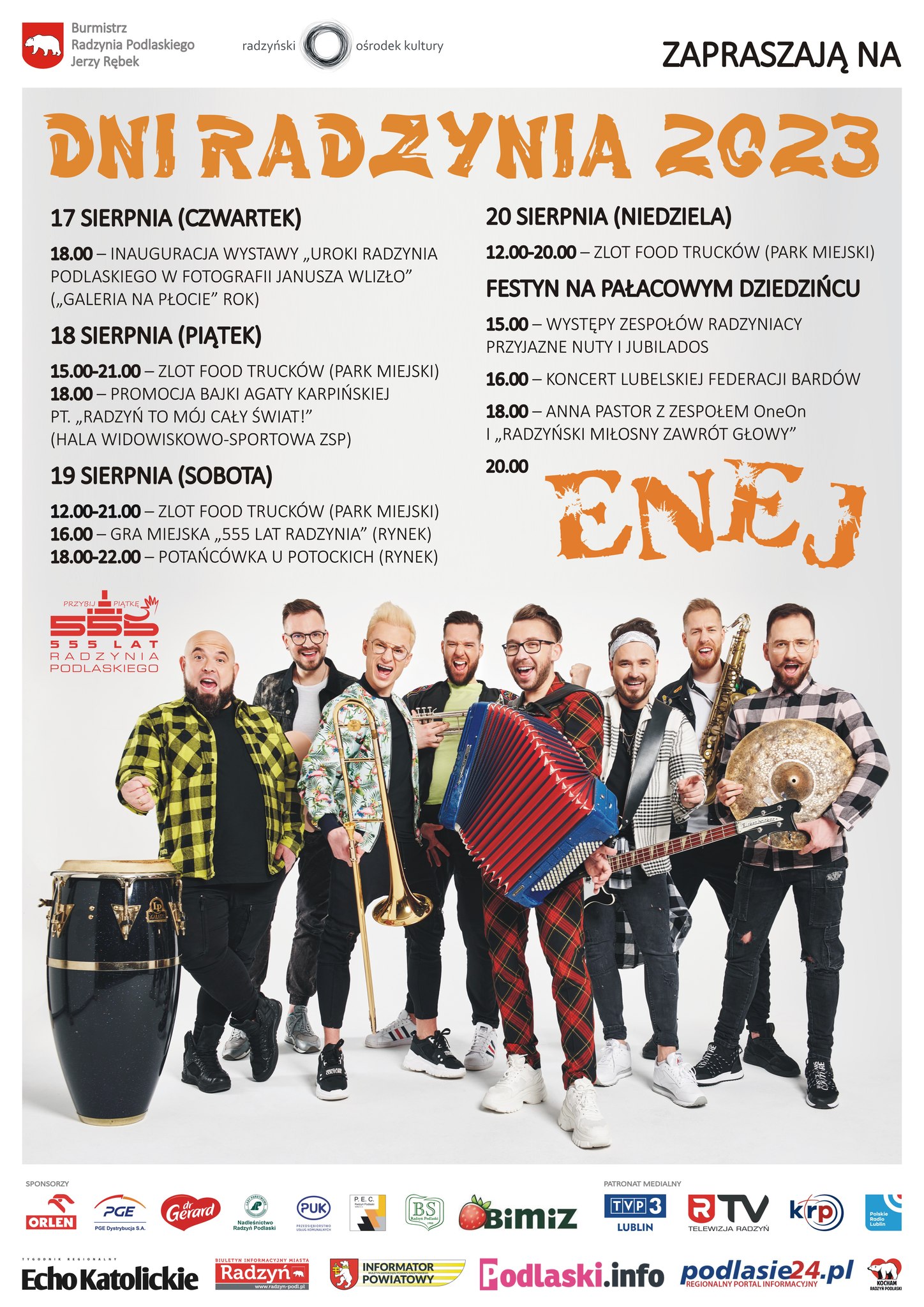 Enej gwiazdą tegorocznych Dni Radzynia. Na scenie wystąpią również Radzyniacy, Lubelska Federacja Bardów, Jubilados oraz wielu innych artystów. Dni Radzynia 2023 będą trwać przez 4 dni więc atrakcji jest sporo. Więcej informacji na plakacie. Patronat medialny nad wydarzeniem sprawuje portal Podlasie24.pl oraz Katolickie Radio Podlasie.