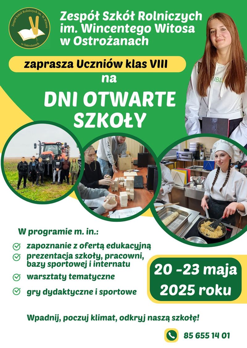 W Zespole Szkół Rolniczych w Ostrożanach dni otwarte zaplanowano w terminie 20 – 23 maja. Tu również można zapoznać się z ofertą edukacyjną, zwiedzić szkołę i skorzystać z przygotowanych atrakcji.