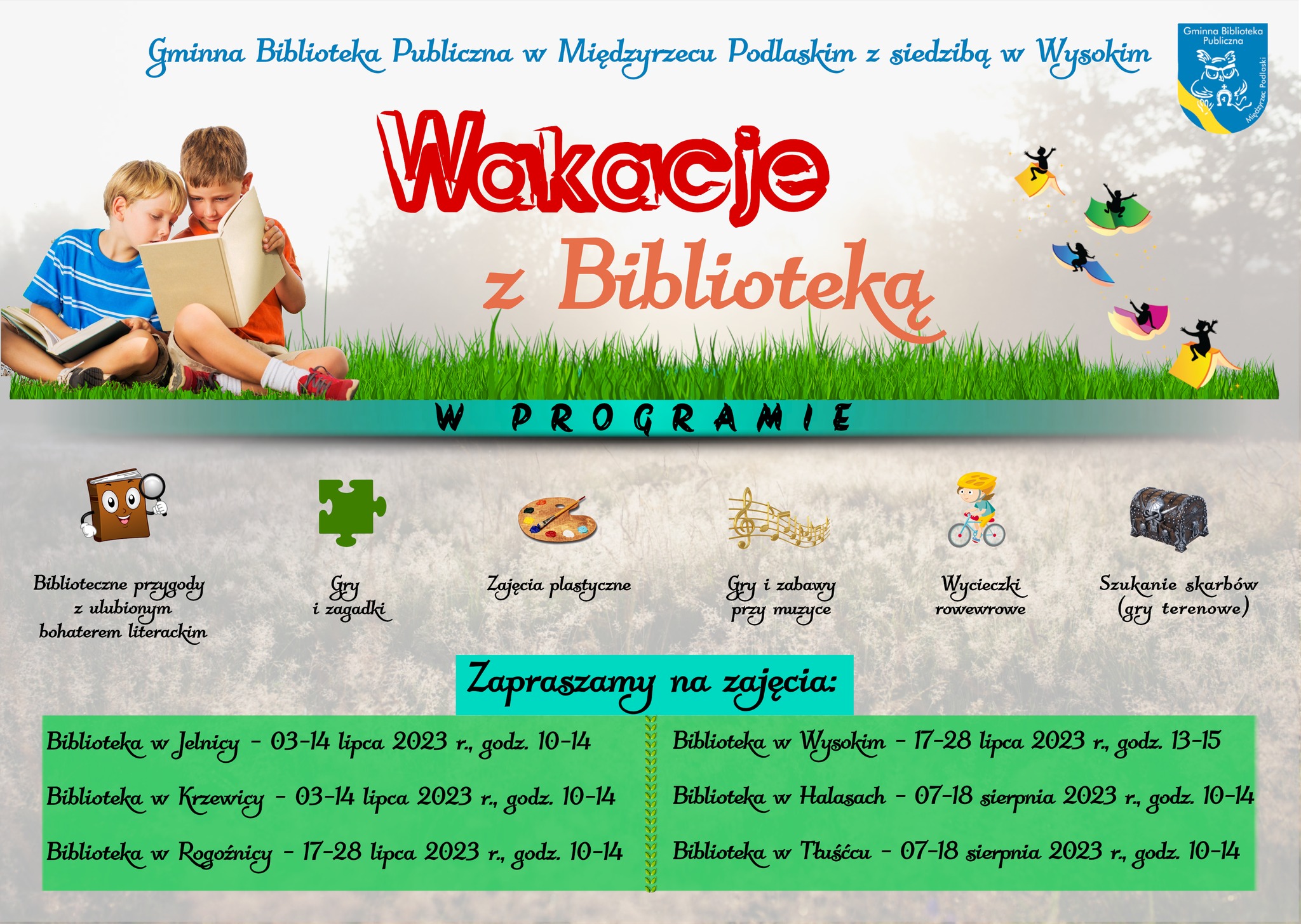 Gmina Biblioteka w Międzyrzecu Podlaskim z siedzibą w Wysokim zaplanowała serię wakacyjnych zajęć dla dzieci. W programie znalazły się biblioteczne przygody z ulubionym bohaterem literackim, gry i zagadki, zajęcia plastyczne, gry i zabawy przy muzyce, wycieczki rowerowe oraz szukanie skarbów.