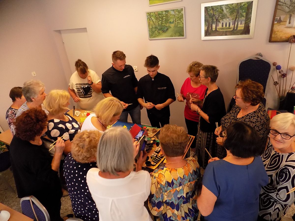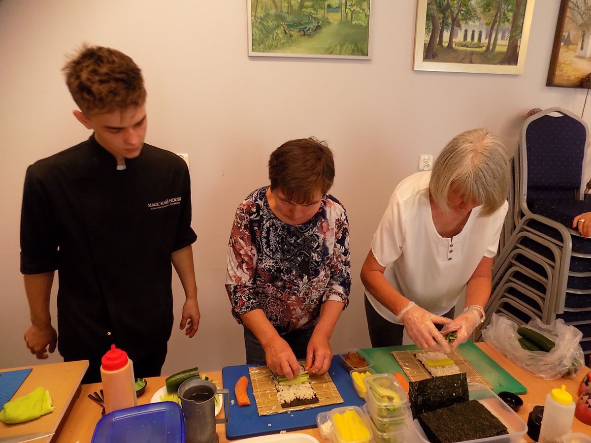 Każdy z uczestników otrzymał zestaw produktów aby wykonać swoje własne sushi. Warsztaty poprzedził krótki wykład na temat historii tego japońskiego dania. Tomasz Kowalczyk wprowadził uczestników w tajniki japońskiej sztuki kulinarnej, a potem wspólnie z sushi masterem Lilko Vova i seniorkami wykonali różne wersje tego przysmaku. Przybliżyli podstawowe terminy i nazwy, co to jest futomak, uromak, hosomak oshinko, kanpyo, toiko, wasabi, hashi, co jest najważniejszym składnikiem tego dania (jak się okazuje nie ryba tylko ryż) oraz jak prawidłowo ugotować w domu ryż do sushi.Warsztaty zostały zrealizowane w ramach projektu ,,Bony dla Seniorów II”, zadanie dofinansowane ze środków budżetu Wojewody Mazowieckiego realizowane przez Stowarzyszenie „Radomskie Centrum Przedsiębiorczości”.