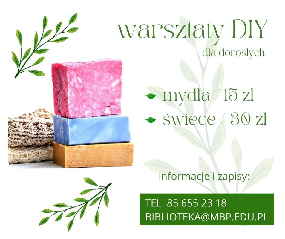 Warsztaty odbędą się w sobotę, 20 stycznia w dwóch turach. O godz. 10.00 - warsztaty wyrobu mydełek naturalnych oraz o godz. 12.30 – warsztaty wyrobu świec. Koszt uczestnictwa wynosi – 15 zł za mydełka i 30 zł za świece.Dodatkowe informacje oraz zapisy pod numerem telefonu 85 655 23 18 lub drogą mailową pisząc na adres biblioteka@mbp.edu.pl.