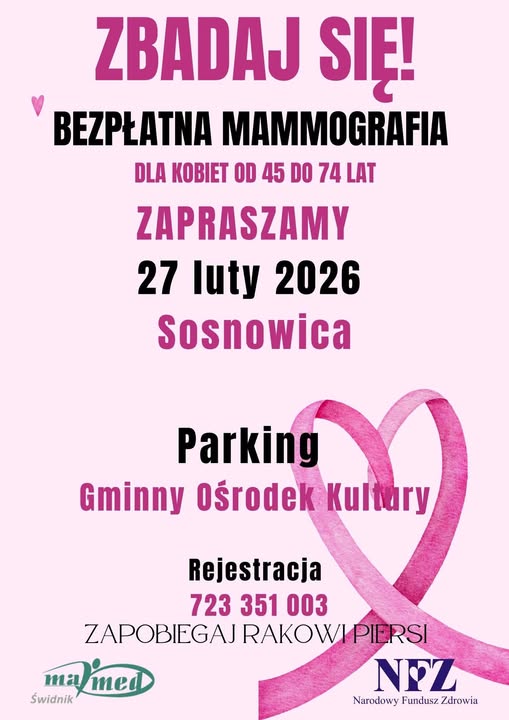 Centrum Wielospecjalistycznej Opieki Ambulatoryjnej NZOZ MARMED w Świdniku realizuje Program Wczesnego Wykrywania Raka Piersi finansowany przez NFZ. W jego ramach kobiety będą mogły skorzystać z bezpłatnego badania mammograficznego w mammobusie. Badanie odbędzie się w piątek 27 lutego przy Gminnym Ośrodku Kultury w Sosnowicy. Z programu mogą skorzystać kobiety w wieku 45–74 lat, które nie miały wykonywanej mammografii w ciągu ostatnich 24 miesięcy.