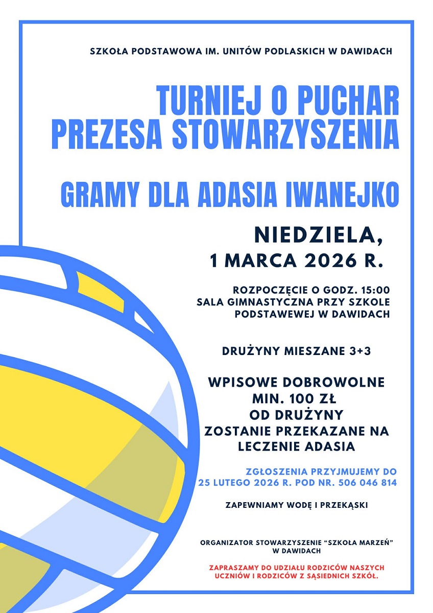 Pod hasłem „Gramy, pomagamy, łączmy siły!” odbędzie się drugi tego dnia charytatywny turniej siatkówki w Szkole Podstawowej w Dawidach. Organizatorzy zapraszają rodziców uczniów oraz rodziców z sąsiednich szkół. Cały dochód z wydarzenia zostanie przeznaczony na leczenie Adasia.