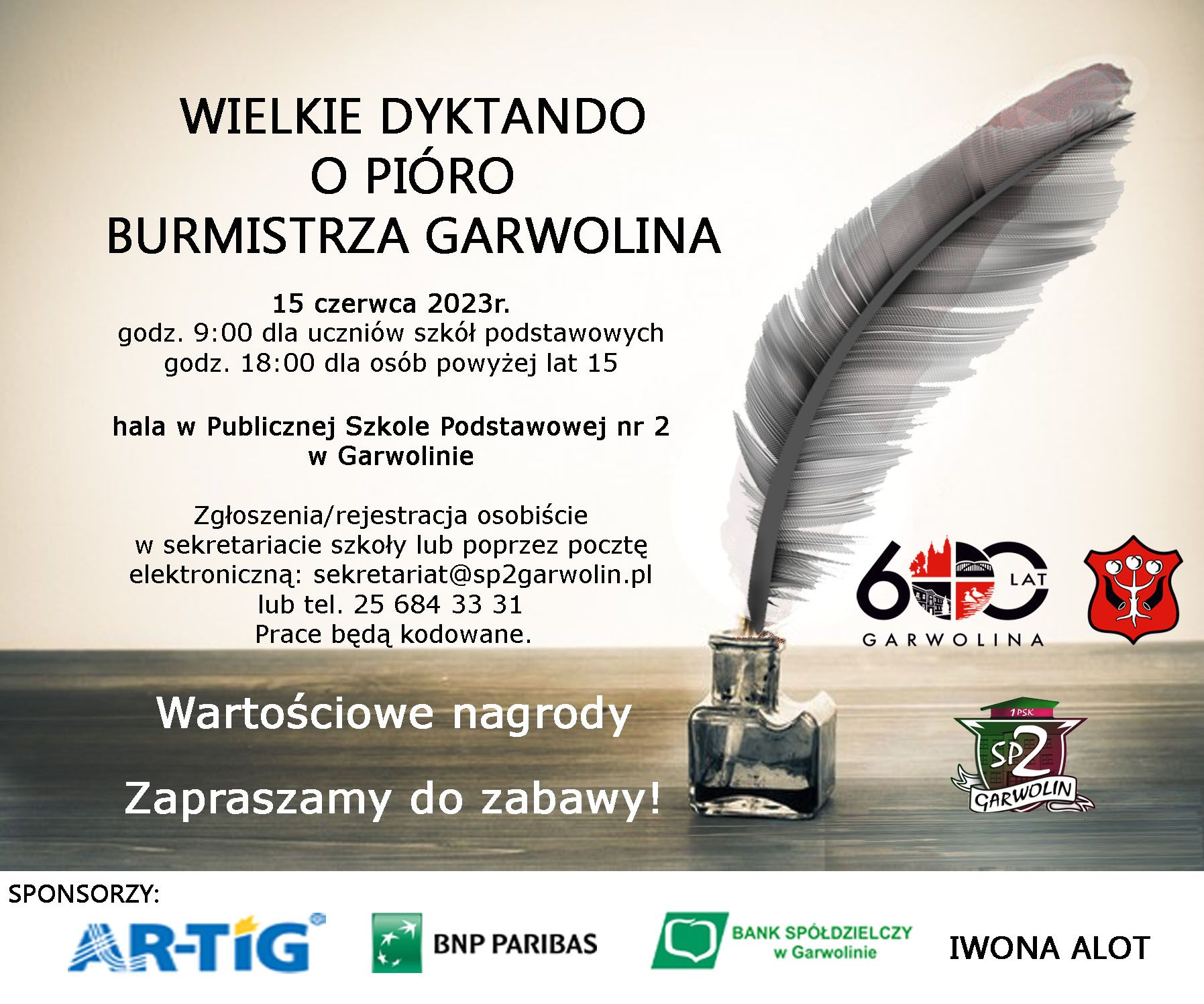 Z okazji 600-lecia Garwolina Publiczna Szkoła Podstawowa nr 2 w Garwolinie zaprasza do zmagań z zawiłościami języka ojczystego podczas Wielkiego Dyktanda o Pióro Burmistrza Garwolina, które odbędzie się 15 maja w siedzibie szkoły.