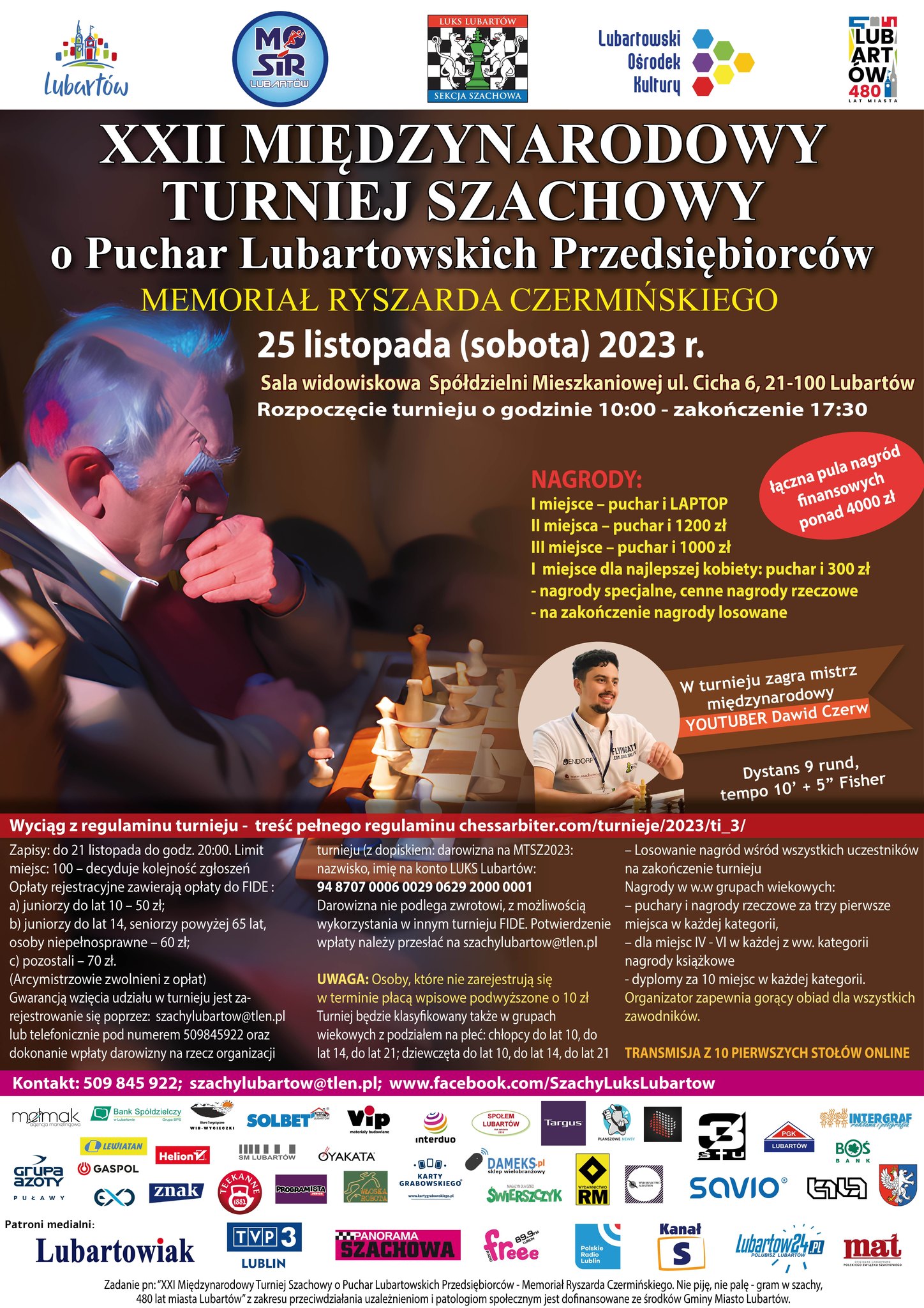 Po raz XXII w Lubartowie zostanie zorganizowany Międzynarodowy Turniej Szachowy o Puchar Lubartowskich Przedsiębiorców - będący Memoriałem Ryszarda Czermińskiego. Na zwycięzców czekają puchary, cenne nagrody finansowe oraz rzeczowe.