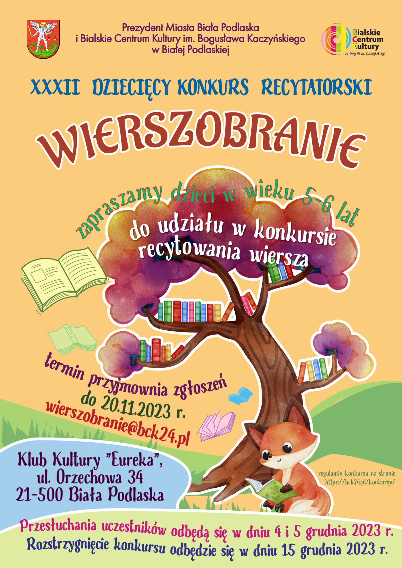 Każdy uczestnik podczas konkursu musi zaprezentować 1 utwór polskiego twórcy, a czas recytacji nie może przekroczyć 1 min. Repertuar powinien być dostosowany do możliwości wiekowych uczestników. Liczba uczestników z jednej grupy nie może przekroczyć 2 osób.Zgłoszenie do udziału w konkursie odbywa się przez złożenie wypełnionej karty zgłoszenia w Klubie Kultury „Eureka”, ul. Orzechowa 34 lub przesłanie na adres e mail: wierszobranie@bck24.pl do 20 listopada.