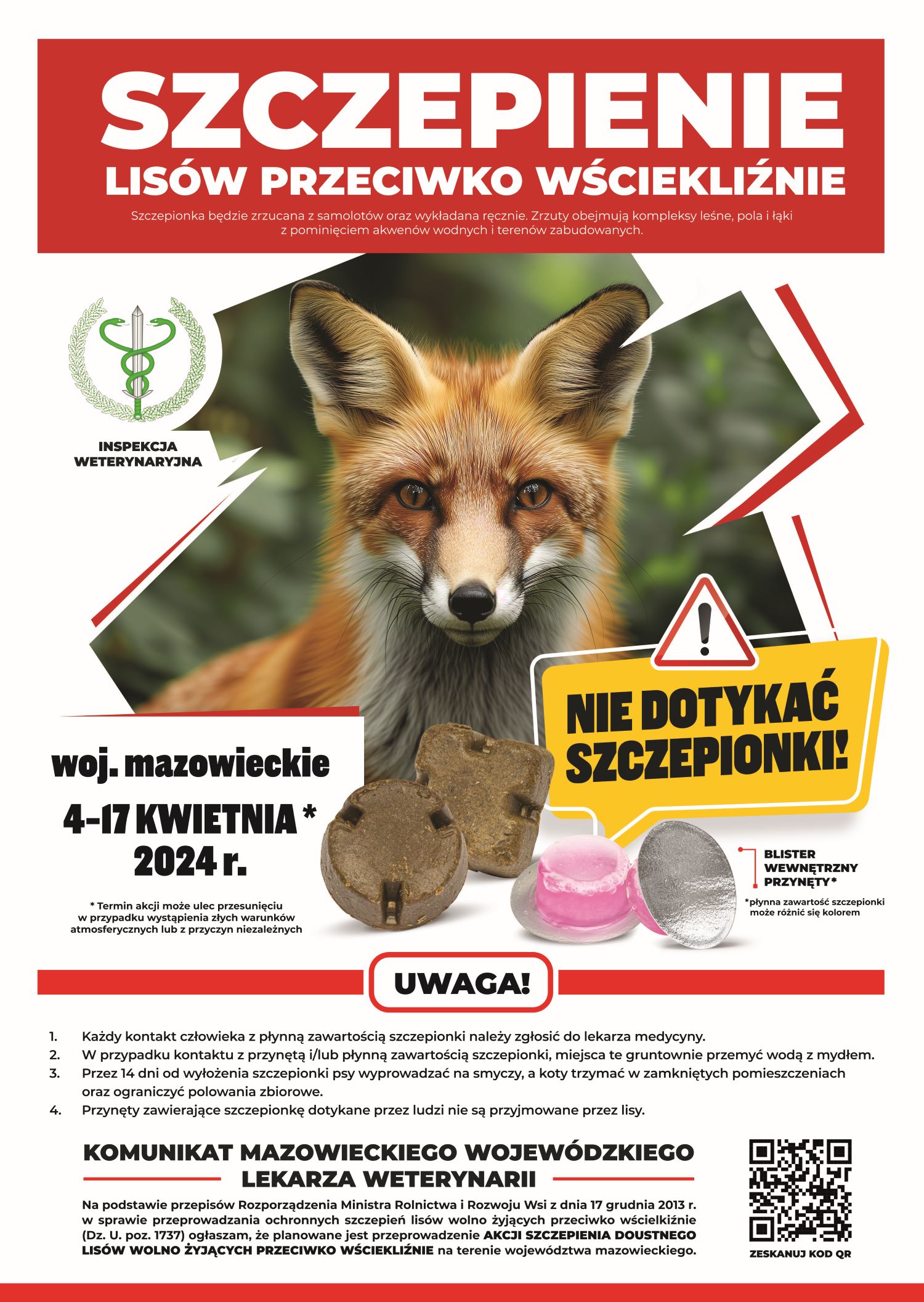 W terminie 4-17 kwietnia Mazowiecki Wojewódzki Lekarz Weterynarii z udziałem Powiatowych Lekarzy Weterynarii przeprowadzi ochronne szczepienie przeciwko wściekliźnie lisów wolno żyjących na terenie województwa mazowieckiego. Szczepionka będzie wykładana ręcznie oraz zrzucana z samolotów na kompleksy leśne, pola i łąki. Przynęty ze szczepionką nie wolno dotykać. Przez dwa tygodnie od wyłożenia szczepionki należy zachować ostrożność podczas wyprowadzania zwierząt.