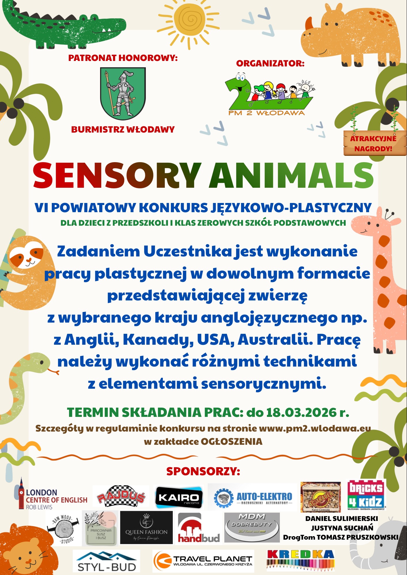 Przedszkole Miejskie nr 2 we Włodawie organizuje dla dzieci z przedszkoli oraz klas zerowych z powiatu włodawskiego szóstą już edycje konkursu językowo - plastycznego. To inicjatywa, która łączy naukę języka angielskiego z twórczą ekspresją plastyczną, gdyż celem konkursu jest między innymi rozbudzanie zainteresowań krajami anglojęzycznymi, rozwijanie kreatywności i pomysłowości dzieci, a także zachęcanie do wspólnego i twórczego spędzania czasu w gronie najbliższych. Wydarzenie stanowi doskonałą okazję, by poprzez kreatywną zabawę rozwijać zainteresowanie językiem angielskim oraz wspólnie z rodziną stworzyć coś naprawdę wyjątkowego.Zadaniem uczestników konkursu jest wykonanie pracy plastycznej przedstawiającej zwierzę z wybranego kraju anglojęzycznego np. Anglii, Kanady, USA czy Australii z wykorzystaniem różnych technik i elementów sensorycznych.