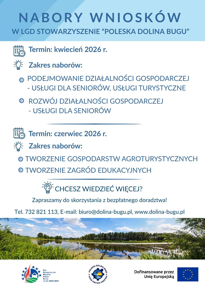Mieszkańcy Gminy Włodawa oraz całego obszaru działania LGD Stowarzyszenie Poleska Dolina Bugu już dziś mogą rozpocząć przygotowania do planowanych w II kwartale 2026 roku naborów wniosków z zakresu przedsiębiorczości oraz rozwoju pozarolniczych funkcji małych gospodarstw rolnych.