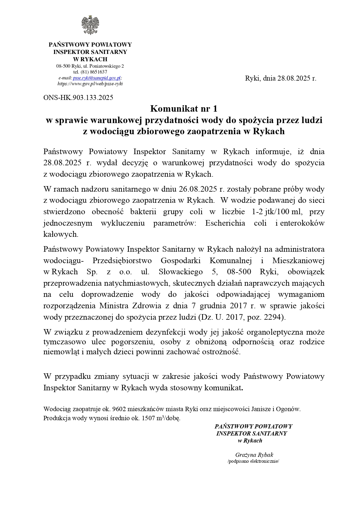 Woda dostarczana z wodociągu zbiorowego zaopatrzenia w Rykach jest warunkowo przydatna do spożycia - poinformował Państwowy Powiatowy Inspektor Sanitarny w Rykach. Decyzja została wydana 28 sierpnia po przeprowadzeniu badań próbek wody pobranych dwa dni wcześniej. Wyniki wykazały obecność bakterii grupy coli w ilości 1–2 jtk/100 ml. Jednocześnie wykluczono obecność bakterii Escherichia coli oraz enterokoków kałowych.