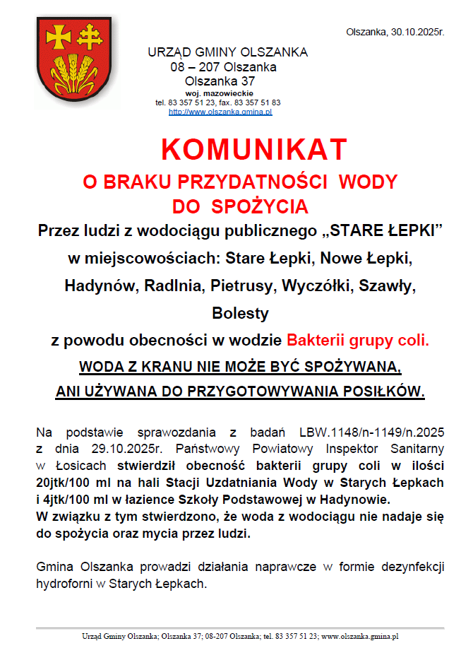 Bakterie z grupy Coli wykryto w wodociągu, z którego korzystają mieszkańcy miejscowości Stare i Nowe Łepki, Hadynów, Radlnia, Pietrusy, Wyczółki, Szawły oraz Bolesty. Z ujęcia tego korzysta około tysiąca osób.