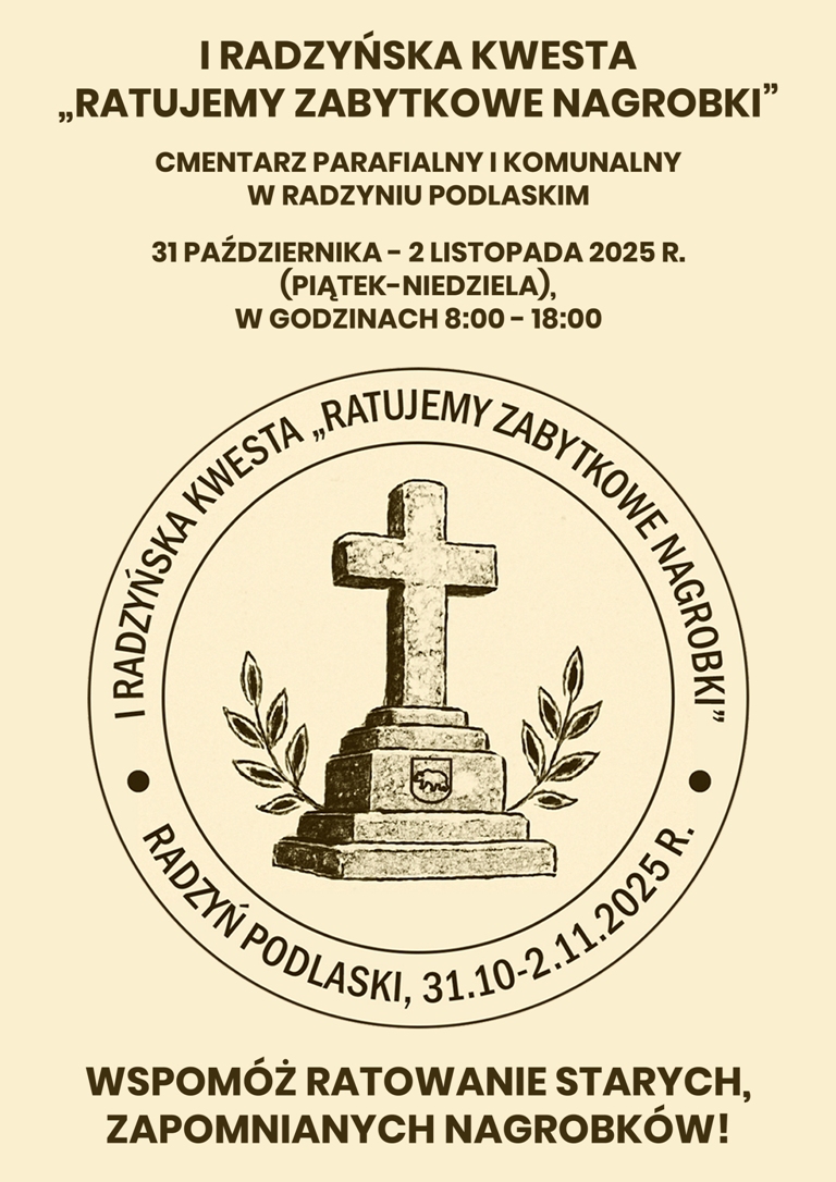 W dniach od 31 października do 2 listopada na cmentarzu parafialnym i komunalnym w Radzyniu Podlaskim odbędzie się I Radzyńska Kwesta „Ratujemy Zabytkowe Nagrobki”. To piękna inicjatywa społeczna, która łączy duchowy wymiar uroczystości Wszystkich Świętych i Dnia Zadusznego z troską o materialne dziedzictwo przeszłości.Msze święte na radzyńskich cmentarzach