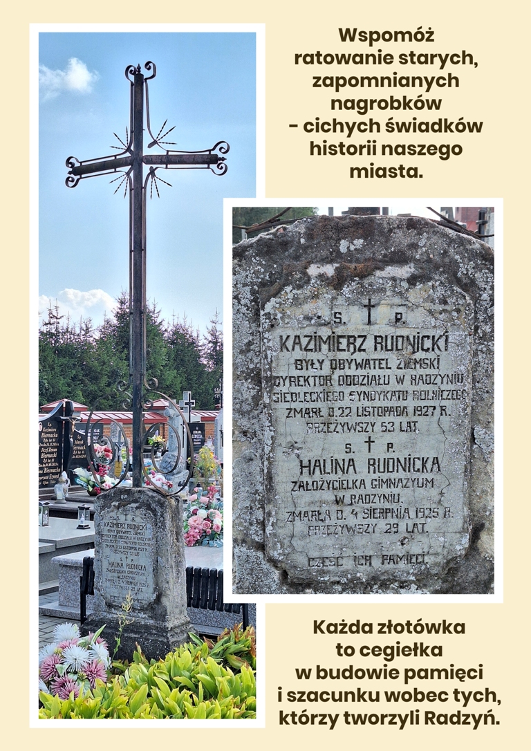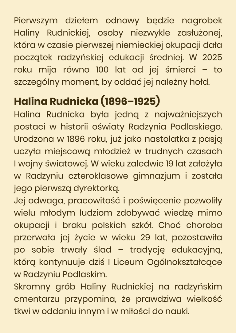 Pierwszym dziełem odnowy będzie nagrobek Haliny Rudnickiej, osoby niezwykle zasłużonej dla lokalnej społeczności. To właśnie ona w czasie pierwszej niemieckiej okupacji dała początek radzyńskiej edukacji średniej. Rok 2025 jest szczególny – mija 100 lat od jej śmierci, co czyni tę inicjatywę symbolicznym hołdem wdzięczności i pamięci.