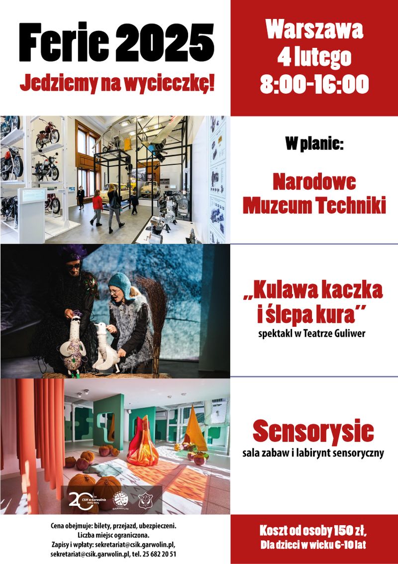 Centrum Sportu i Kultury w okresie zimowego wypoczynku wychodzi z propozycją różnych działań skierowanych przede wszystkim do dzieci wczesnoszkolnych. Podobnie będzie w tym roku. W plan ferii wpisane są dwie wycieczki. Jechać nie trzeba daleko, a atrakcji będzie moc.- Wycieczki to jest to, co dzieci lubią najbardziej. I w ferie i wakacje widzimy duże zainteresowanie tą formą wypoczynku. Staramy się, by proponowane przez nas działania miały walory edukacyjne i jednocześnie, by sprawiały dzieciom dużo radości – mówi Barbara Kupczyk-Mikulska, koordynatorka działań. Obie propozycje wycieczek dotyczą Warszawy i odbędą się w pierwszym tygodniu ferii zimowych. Koszt jednej wycieczki to 150 zł od dziecka. Obejmuje on: wszystkie wejścia, bilety, przewodników, przejazd oraz ubezpieczenie. Zapisy prowadzi sekretariat CSiK. Płatności za wycieczkę można dokonać stacjonarnie lub online, na konto, w ciągu trzech dni od zapisu. Liczba miejsc jest ograniczona. Punkt zbiórki i odbioru dzieci to parking przy Pływalni Miejskiej Garwolanka. Wycieczki adresowane są do dzieci w wieku 6-10 lat. Regulamin dostępny jest na stronie https://csik.garwolin.pl/wy-jechane-ferie/#more-38317.