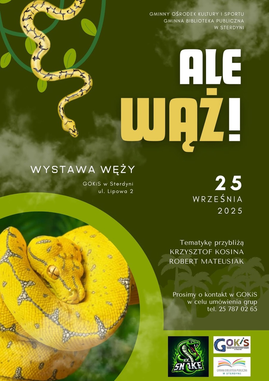 Z kolei w czwartek, 25 września, w GOKiS w Sterdyni odbędzie się coś nietypowego – wystawa węży. To okazja nie tylko dla miłośników egzotycznych zwierząt, ale także dla rodzin z dziećmi, które chcą zobaczyć coś innego niż zwykle.