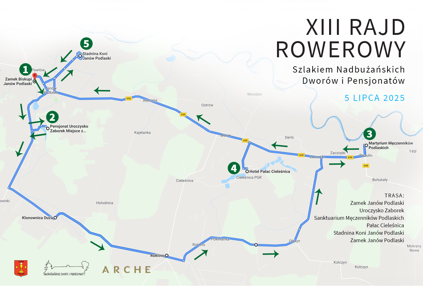 Trasa rajdu poprowadzi rowerzystów przez malownicze tereny, w tym Pensjonat Uroczysko Zaborek, Martyrium Męczenników Podlaskich, Hotel Pałac Cieleśnica, a także Stadninę Koni w Janowie Podlaskim. Uczestnicy będą mieli okazję odkryć urokliwe zakątki Podlasia, jednocześnie ciesząc się aktywnością fizyczną na świeżym powietrzu. Rajd ma charakter rekreacyjny, co sprawia, że jest to doskonała okazja do spędzenia czasu z rodziną i znajomymi w otoczeniu zapierającej dech w piersiach przyrody.Organizatorzy zapraszają do udziału w rajdzie wszystkich chętnych, którzy pragną poznać uroki regionu, poprawić kondycję fizyczną oraz spędzić czas w gronie pasjonatów rowerowych wycieczek. W poprzedniej edycji rajdu wzięło udział blisko 300 osób, co świadczy o rosnącym zainteresowaniu tym przedsięwzięciem.