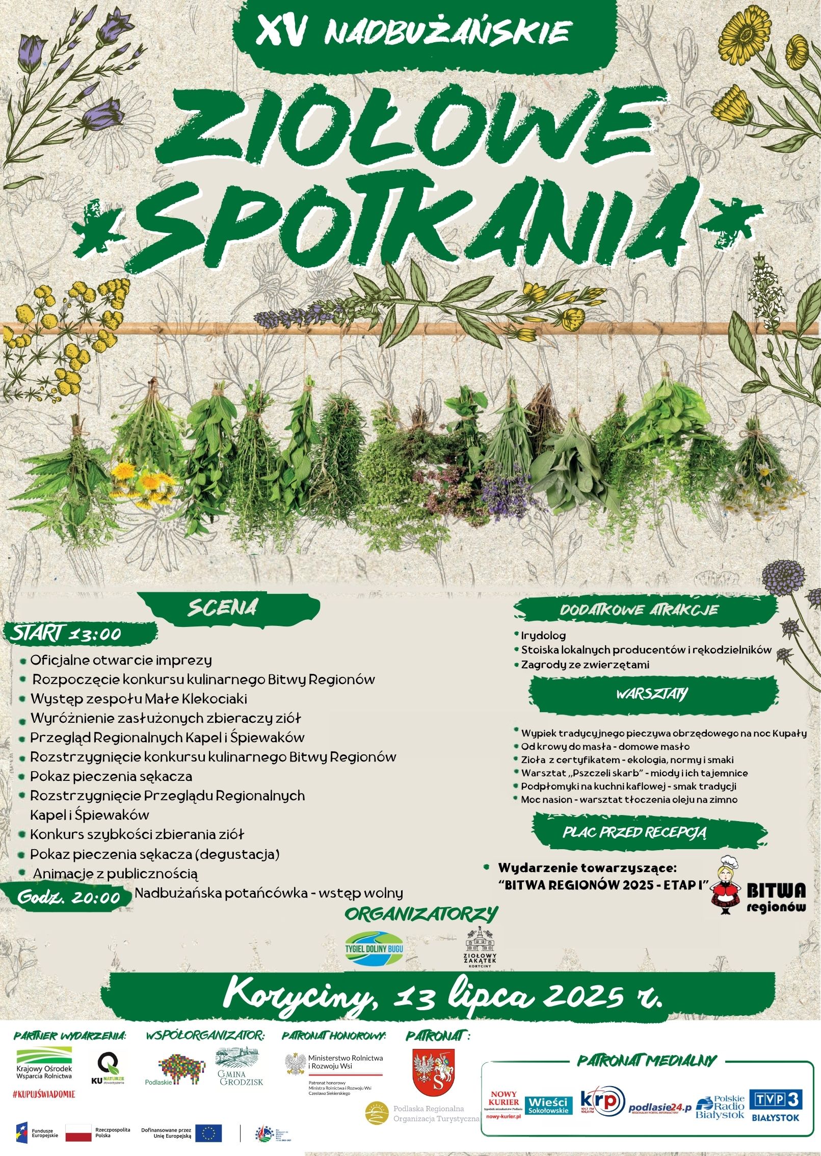 Jubileuszowa, piętnasta edycja Nadbużańskich Ziołowych Spotkań odbędzie się w Korycinach (gmina Grodzisk) w najbliższą niedzielę. Program przewiduje liczne atrakcje dla miłośników tradycji, muzyki, kuchni regionalnej i zielarskiego dziedzictwa. Początek o godzinie 13:00.