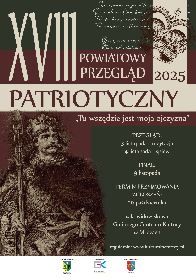 Do 20 października przyjmowane są zgłoszenia do XVIII Powiatowego Przeglądu Patriotycznego w Mrozach, który w tym roku odbywa się pod hasłem „Tu wszędzie jest moja ojczyzna”. Listopadowa inicjatywa Gminnego Centrum Kultury im. Heleny Wielobyckiej będzie okazją do artystycznej wypowiedzi i wspólnej refleksji nad historią oraz dziedzictwem narodowym. Przegląd objęty jest honorowym patronatem Burmistrza Mrozów, a jego współorganizatorem jest Powiat Miński.