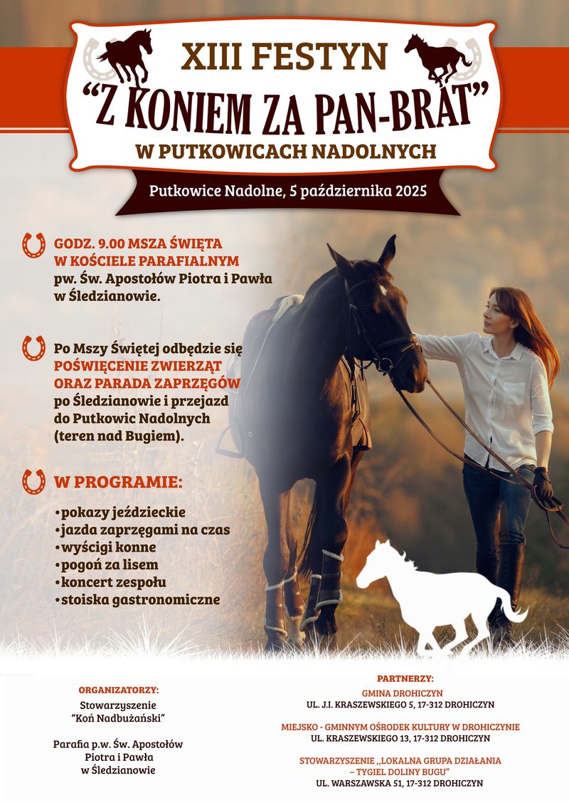 13. Festyn „Z Koniem za Pan-Brat” w Putkowicach Nadolnych organizują - Stowarzyszenie „Koń Nadbużański”, Parafia pw. Św. Apostołów Piotra i Pawła w Śledzianowie oraz Gmina Drohiczyn, Miejsko Gminny Ośrodek Kultury w Drohiczynie i Stowarzyszenie LGD Tygiel Doliny Bugu.