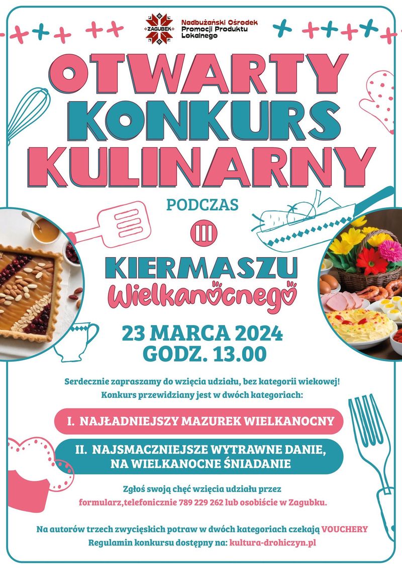13.00 – 15.30 Otwarty Konkurs Kulinarny, konkurs odbędzie się kategoriach: najładniejszy mazurek wielkanocny i najsmaczniejsze wytrawne danie na wielkanocne śniadanie