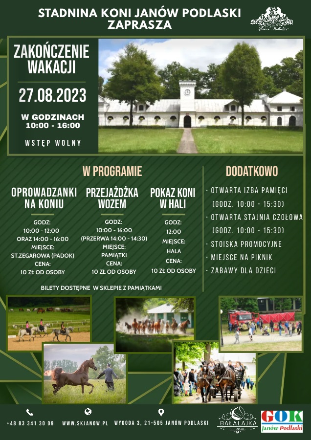 Stadnina Koni w Janowie Podlaskim zaprasza w ostatnią niedzielę sierpnia na zakończenie wakacji. Będzie można zwiedzać jej obiekty, obejrzeć pokaz koni, a także przejechać się wozem czy dosiąść jednego z rumaków z janowskiej hodowli. Organizatorzy zakończenia wakacji w Stadninie w Janowie Podlaskim zachęcają również do zorganizowania rodzinnych pikników na jej terenach zielonych.