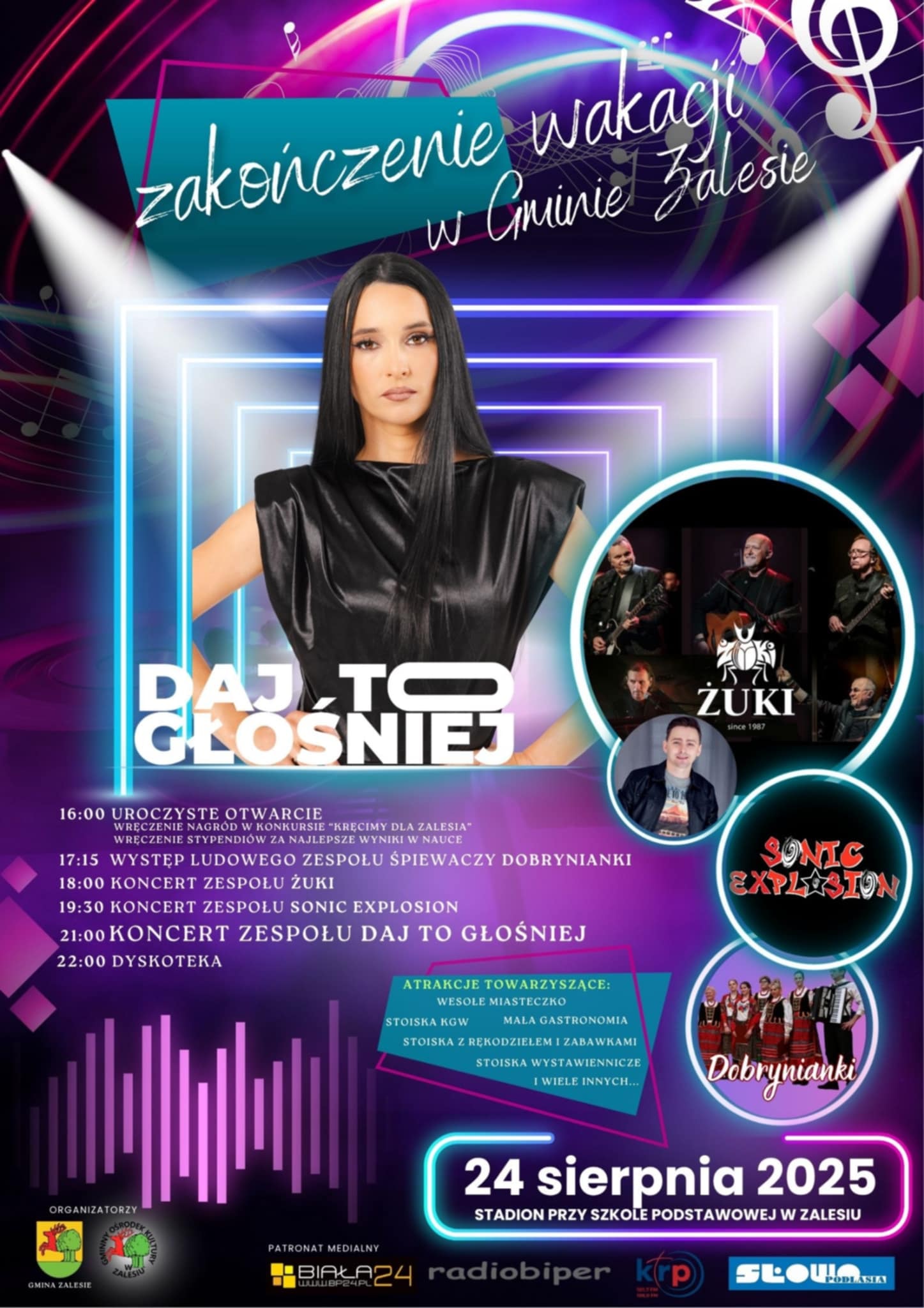 Uroczystość rozpocznie się o godzinie 16:00. Na początek przewidziano wręczenie nagród w konkursie „Kręcimy dla Zalesia” oraz stypendiów za najlepsze wyniki w nauce. To wyjątkowa okazja, by uhonorować młodych, zdolnych mieszkańców gminy.Następnie scena należeć będzie do artystów. O 17:15 wystąpi zespół ludowy Dobrynianki, wprowadzając publiczność w klimat tradycji i regionalnej muzyki. Później nadejdzie czas na mocniejsze brzmienia – o 18:00 koncert zespołu Żuki, a o 19:30 na scenie pojawi się grupa Sonic Explosion.