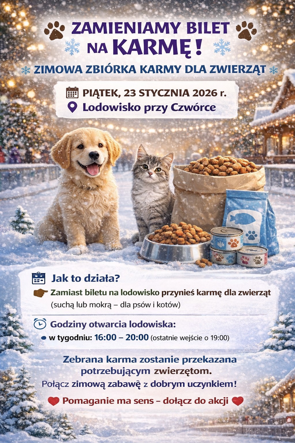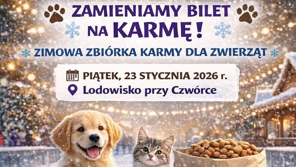 Wejście na lodowisko, działające przy Szkole Podstawowej nr 4, będzie dziś możliwe w zamian za karmę dla psów lub kotów – suchą lub mokrą. Zebrane dary zostaną przekazane zwierzętom potrzebującym wsparcia, m.in. z lokalnych schronisk i organizacji pomocowych.Lodowisko funkcjonować będzie w standardowych godzinach otwarcia, tj. od 16:00 do 20:00, przy czym ostatnie wejście przewidziane jest na godzinę 19:00.