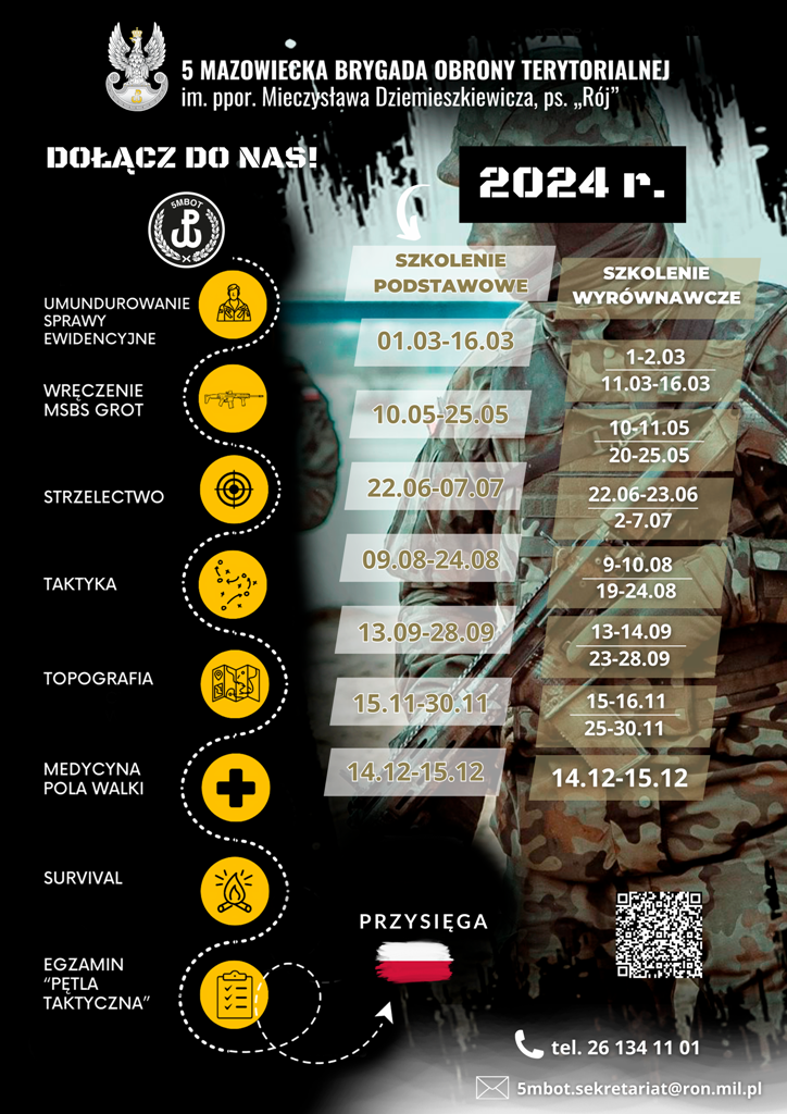 Nowy rok szkoleniowy w 5 Mazowieckiej Brygadzie Obrony Terytorialnej rozpoczął się od szkolenia podstawowego i wyrównawczego w ramach „Ferii z WOT”. Styczniowe powołanie do Terytorialnej Służby Wojskowej zgromadziło głównie osoby młode – uczniów i studentów, którzy skorzystali z czasu wolnego podczas zimowej przerwy w nauce w województwie Mazowieckim.Dla wszystkich nowych ochotników do wstąpienia w szeregi Terytorialsów 5MBOT przygotowała w roku 2024 jeszcze 7 powołań na szkolenia podstawowe oraz wyrównawcze. Najbliższe rozpocznie się już 1 marca. Kolejne zaplanowane są w miesiącach: maj, czerwiec, sierpień, wrzesień, listopad oraz grudzień.