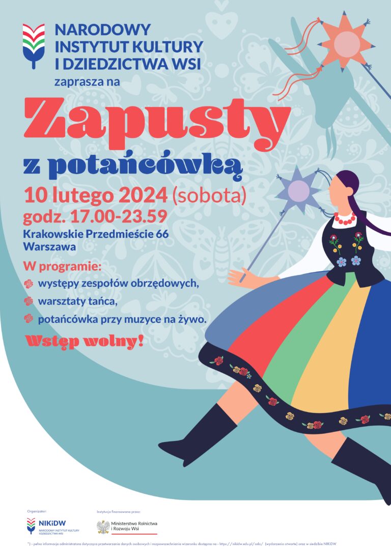 10 lutego, w ostatnią sobotę karnawału, Narodowy Instytut Kultury i Dziedzictwa Wsi zaprasza na zapustny wieczór z potańcówką. Będą widowiska obrzędowe, muzyka na żywo oraz przysmaki przygotowane przez koła gospodyń wiejskich.