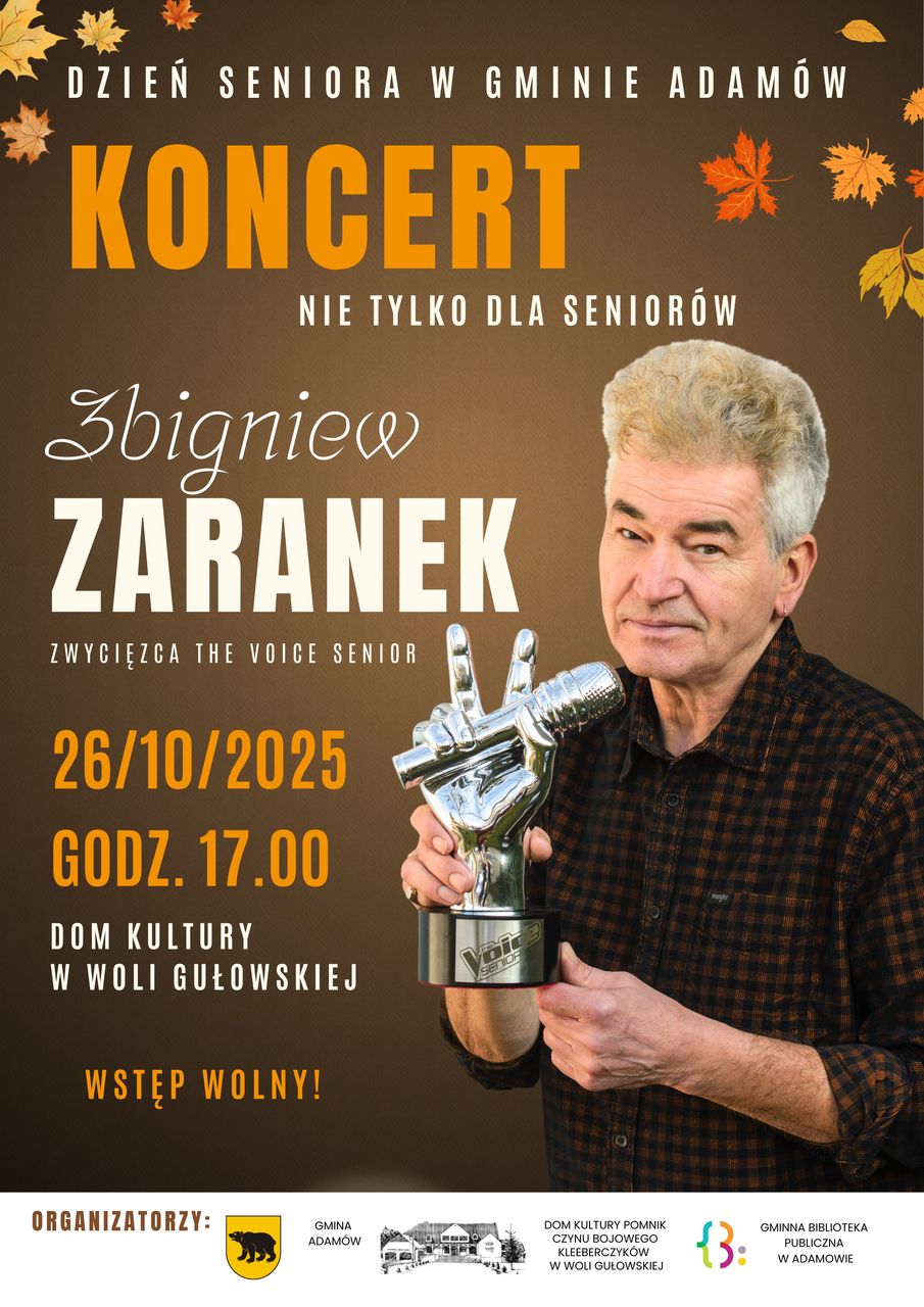 Zbigniew Zaranek, zwycięzca programu The Voice Senior, będzie gwiazdą Europejskiego Dnia Seniora w gminie Adamów. Koncert odbędzie się w Domu Kultury w Woli Gułowskiej, w niedzielę 26 października.