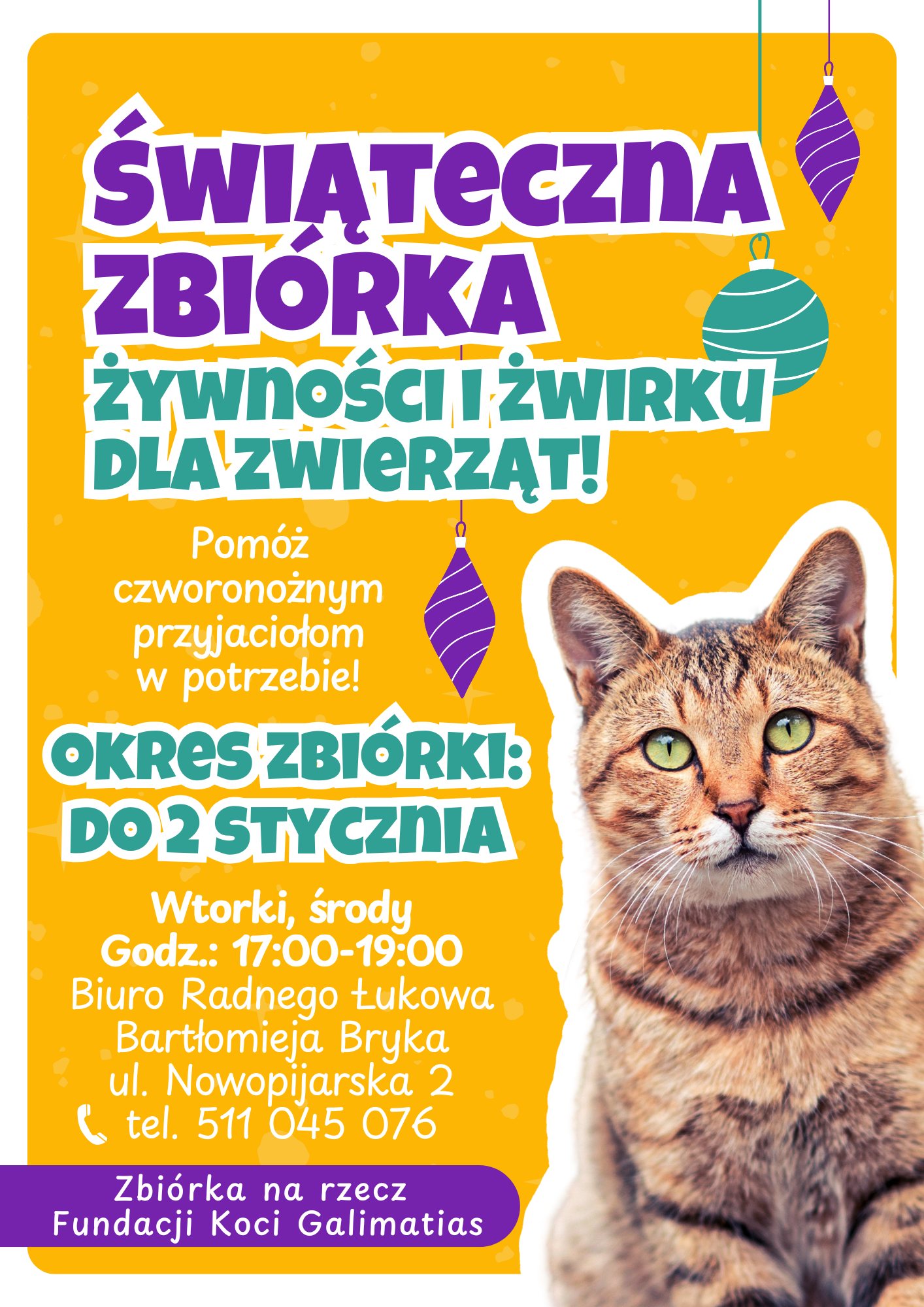 Zbiórka potrwa do 2 stycznia. Dary można przynosić we wtorki i środy, w godzinach 17:00–19:00, do biura radnego Bartłomieja Bryka przy ul. Nowopijarskiej 2. W razie pytań dostępny jest numer kontaktowy: 511 045 076.Organizatorzy zachęcają mieszkańców do wsparcia akcji i podkreślają, że każda, nawet niewielka pomoc ma ogromne znaczenie dla kotów przebywających pod opieką fundacji Koci Galimatias.