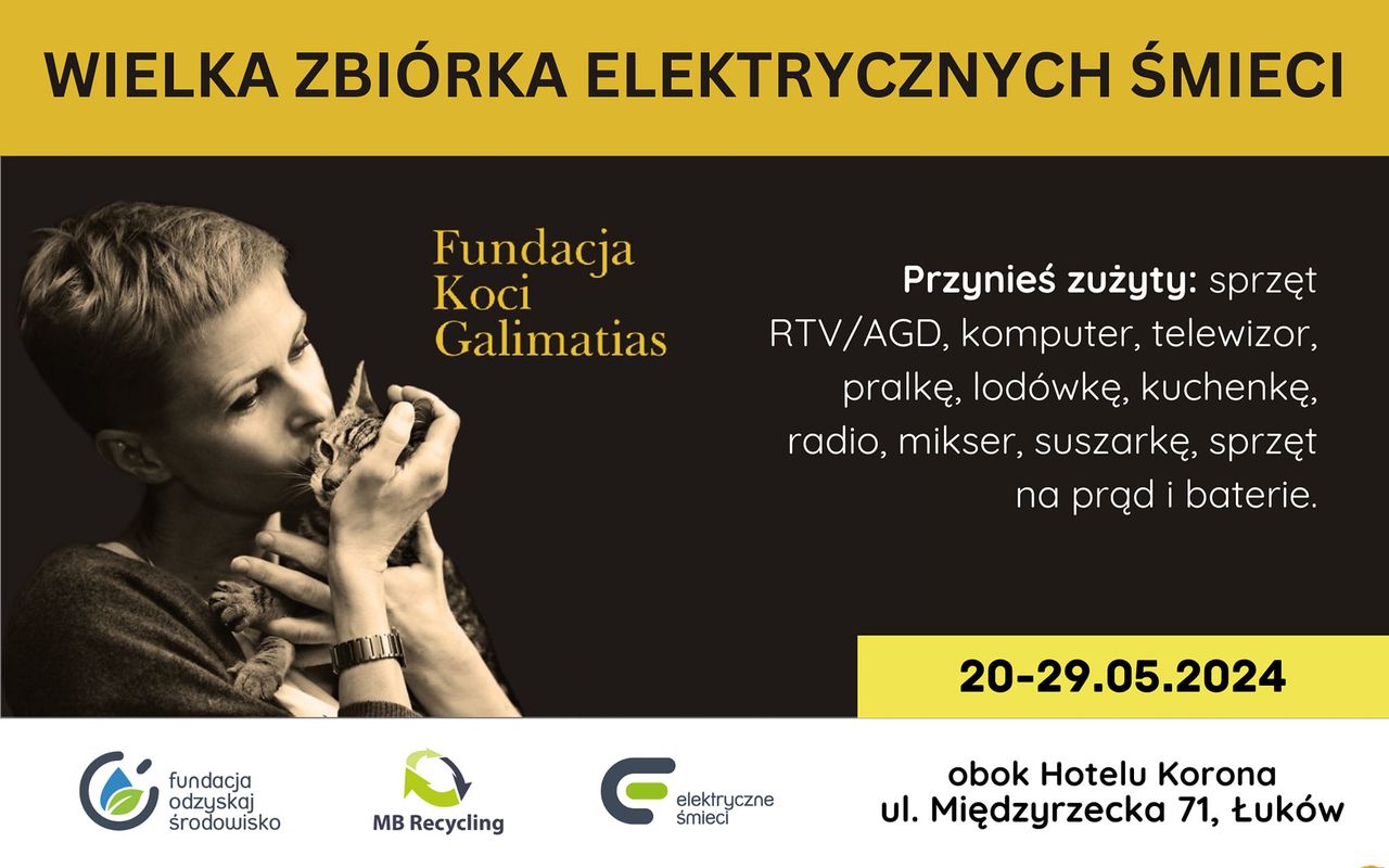 W Łukowie wciąż trwa zbiórka elektroodpadów na rzecz łukowskiej Fundacji Koci Galimatias. Miała zakończyć się 29 maja, ale została wydłużona i potrwa jeszcze do 3 czerwca.