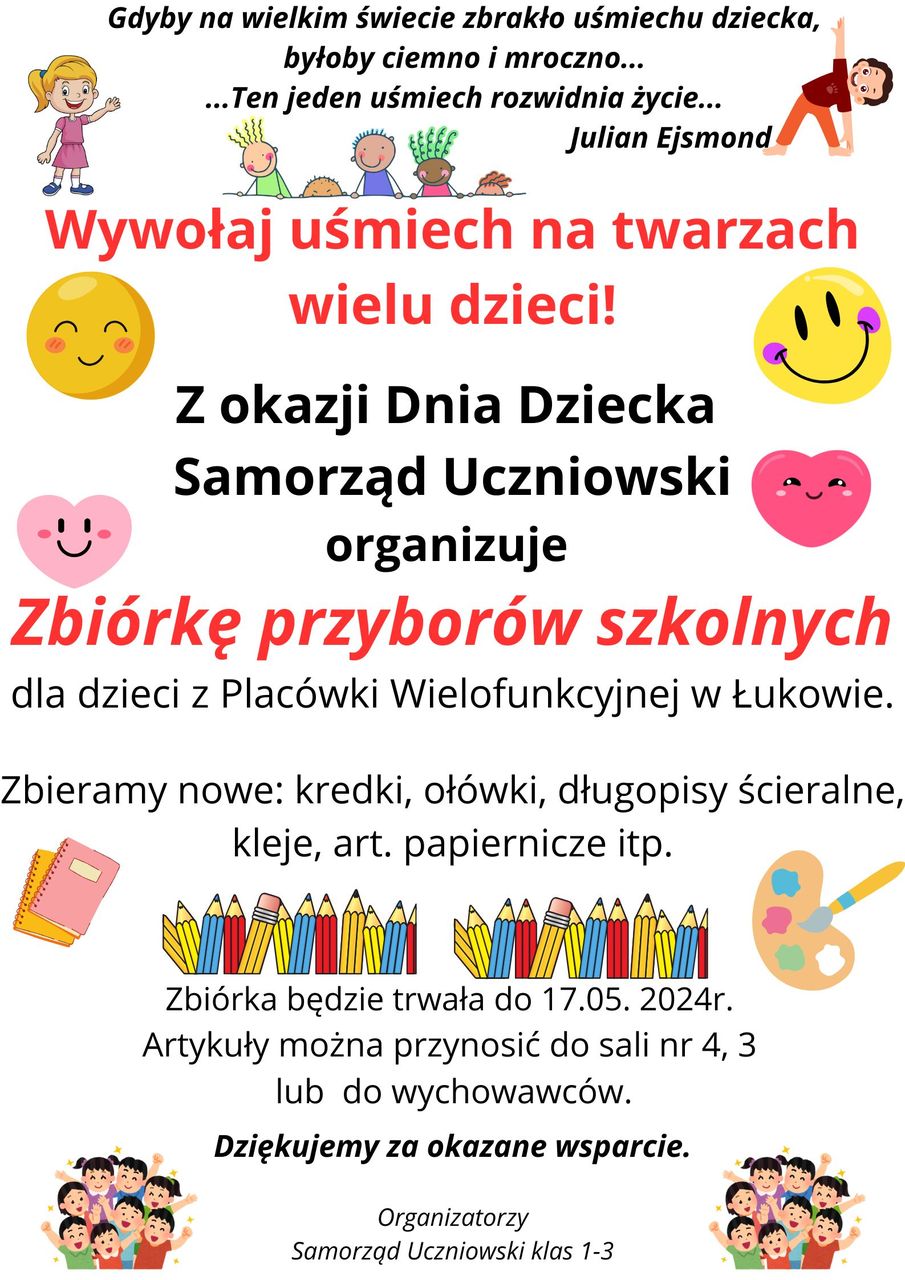 Okazją do zorganizowania zbiórki jest zbliżający się Dzień Dziecka. Zbierane będą kredki, ołówki, długopisy, kleje i artykuły papiernicze. Można je przynosić do sal numer 3 i 4. Zbiórka będzie trwała do 17 maja. Każdy kto chce może się w nią włączyć.