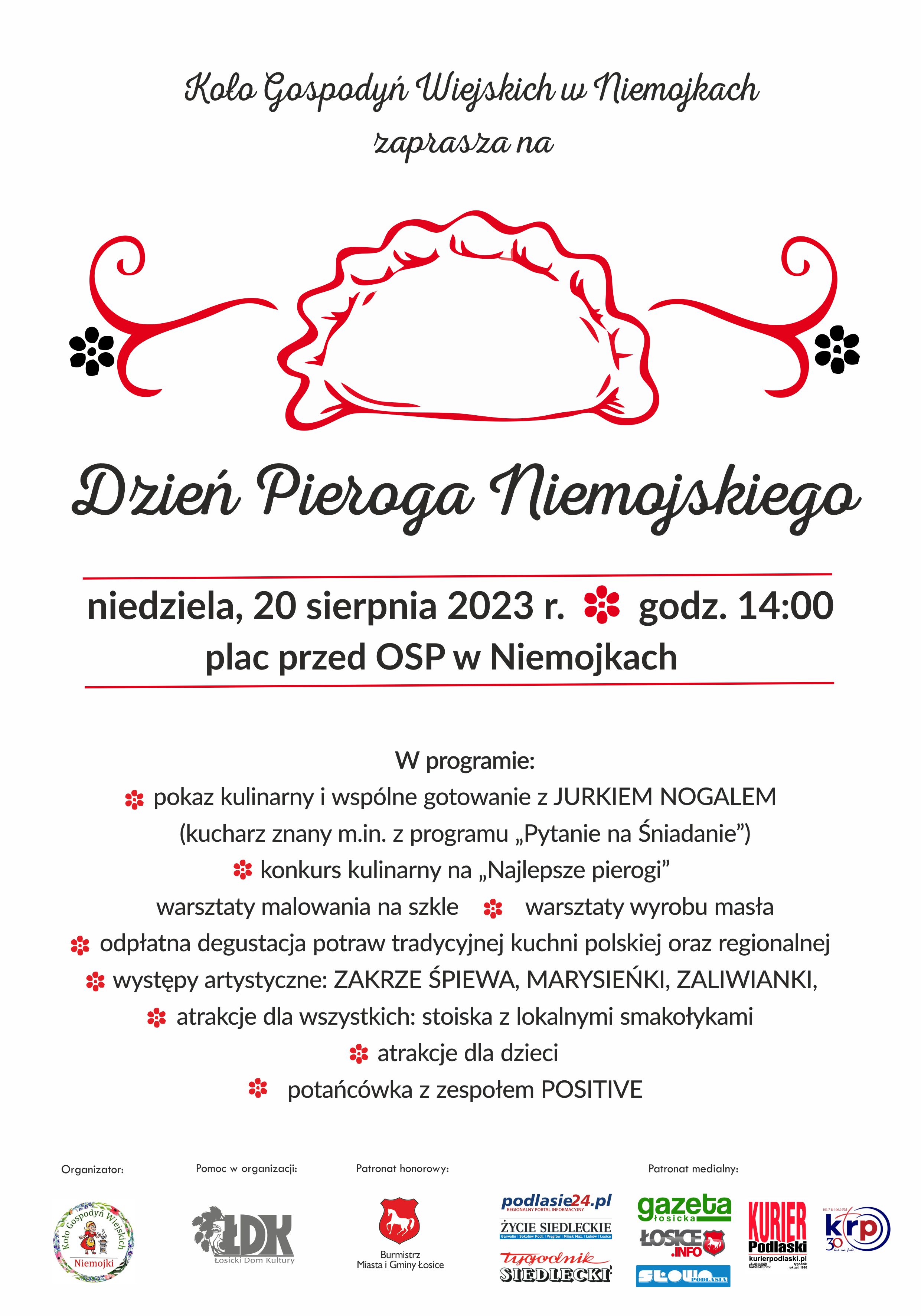 Koło Gospodyń Wiejskich w Niemojkach zaprasza na czwartą edycję „Dnia Pieroga Niemojskiego”, która odbędzie się w niedzielę, 20 sierpnia na placu przy OSP w Niemojkach. W programie m.in. wspólne gotowanie z Jurkiem Nogalem, kucharzem znanym m.in. z programu „Pytanie na Śniadanie”.