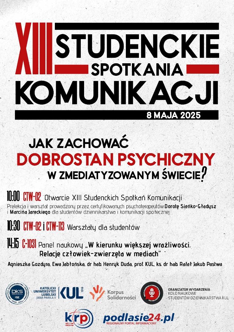 XIII Studenckie Spotkania Komunikacji na Katolickim Uniwersytecie Lubelskim odbędą się 8 maja 2025 r. Wydarzenie, organizowane przez studentów dziennikarstwa i komunikacji społecznej KUL oraz Koło Naukowe Studentów Dziennikarstwa, skupi się na temacie: „Jak zachować zdrowie psychiczne w zmediatyzowanym świecie?”.