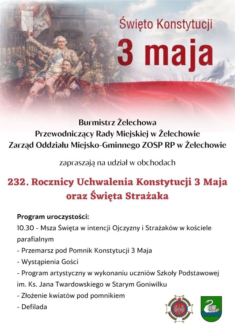 Tradycyjnie już Święto Konstytucji 3 Maja obchodzone jest w Żelechowie wspólnie ze świętem strażaków i ma szczególny wymiar. Uroczystości rozpoczną się o godz. 10:30 Mszą św. odprawioną w kościele parafialnym w intencji Ojczyzny i strażaków.