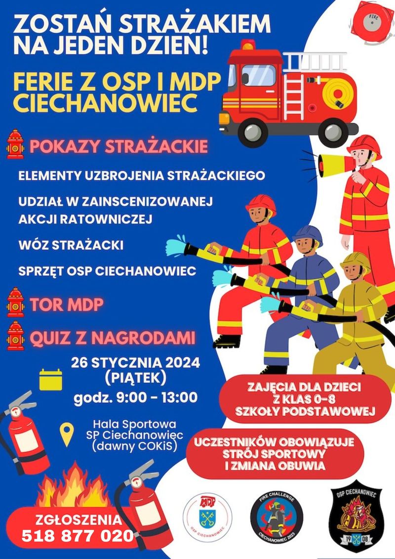 Zostań strażakiem w jeden dzień, tymi słowami OSP Ciechanowiec i MDP w Ciechanowcu zapraszają dzieci i młodzież na zajęcia, które odbędą się w piątek, 26 stycznia w godz. 9.00 – 13.00 w hali sportowej SP Ciechanowiec.